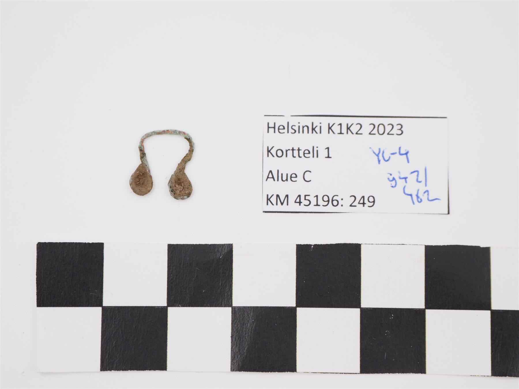 | Hela? Hyvin pieni kupariseoksesta tai pronssista valmistettu hevosenkengän muotoinen hela, jonka päät taivutettu ympäri | |