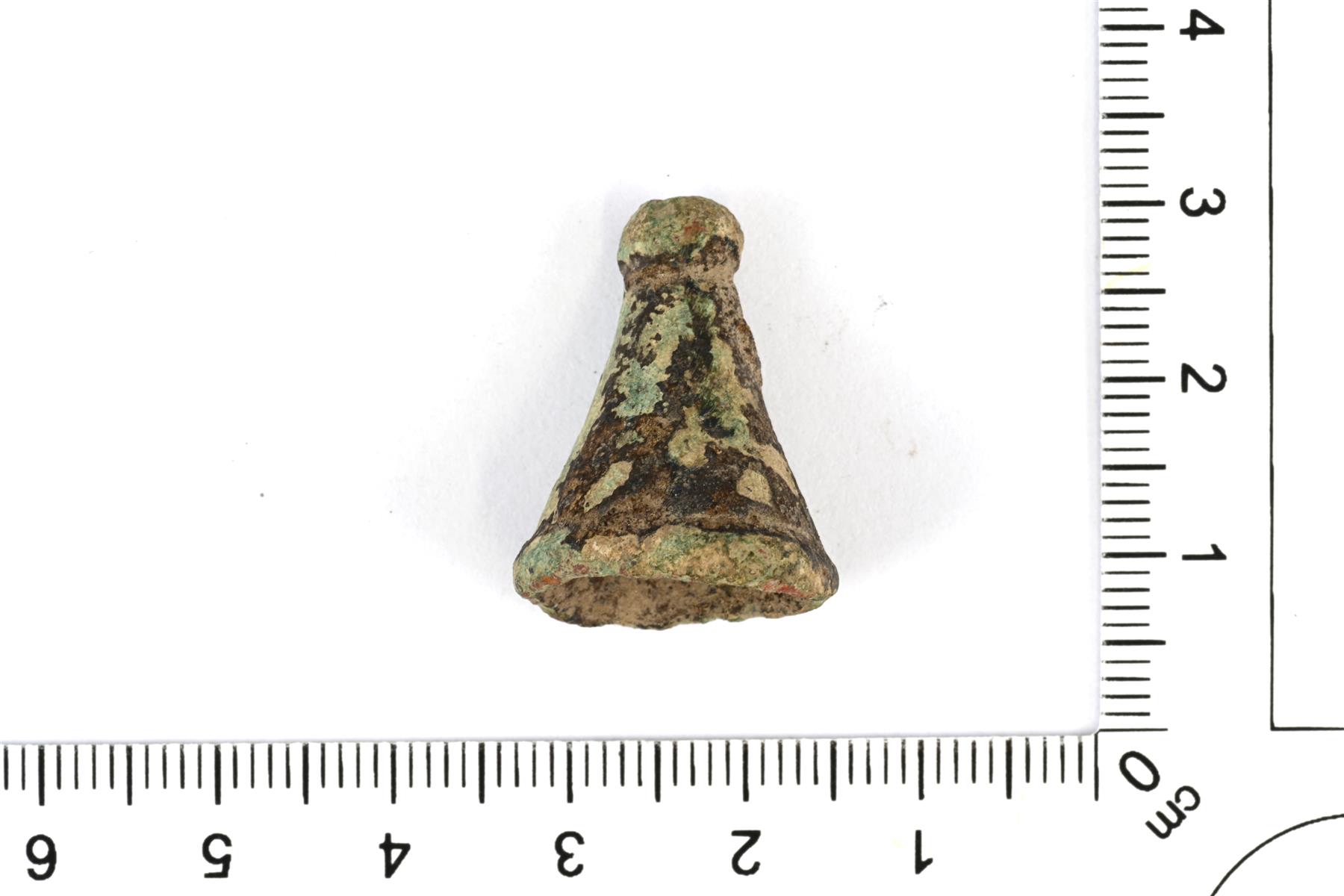 | Katkaistun kartion muotoinen kelloriipus. Alareunassa on paksumpi kohovyö. Yläosan läpi menee reikä. Edustaa Rainion A-tyypin kelloriipuksia. Vrt. kuva 24 d | |
