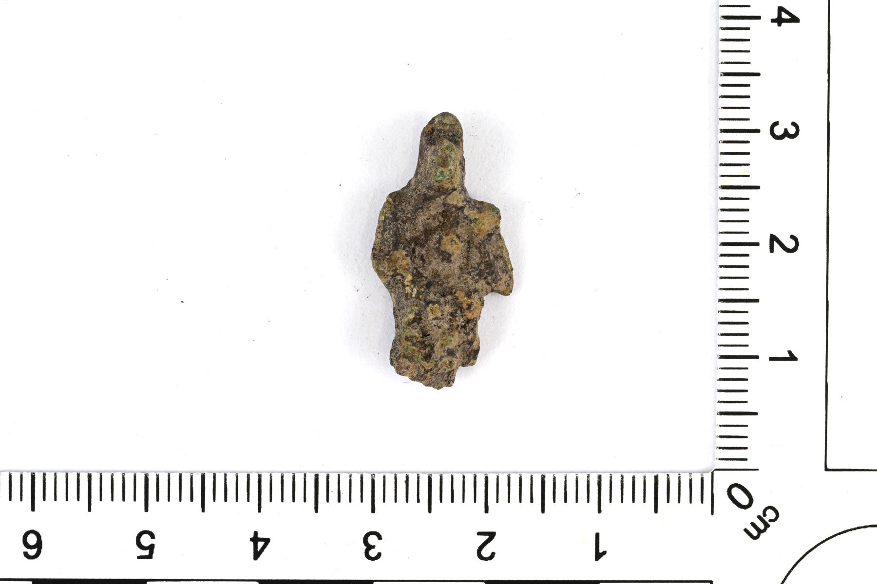 | Huonosti säilyneen riipuksen katkelma. Yläosan ripustuslenkki on hajonnut ja reunoilla erottuu mahdollisia reikäkuvioiden reunoja. | |