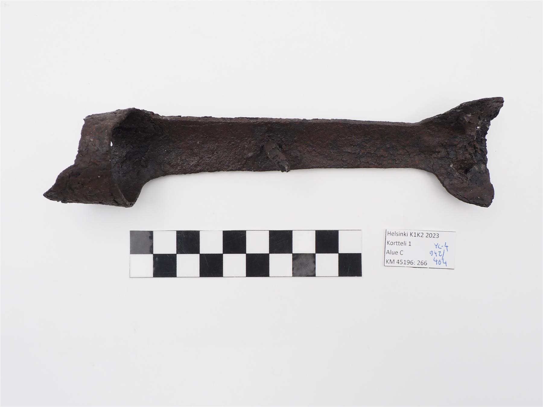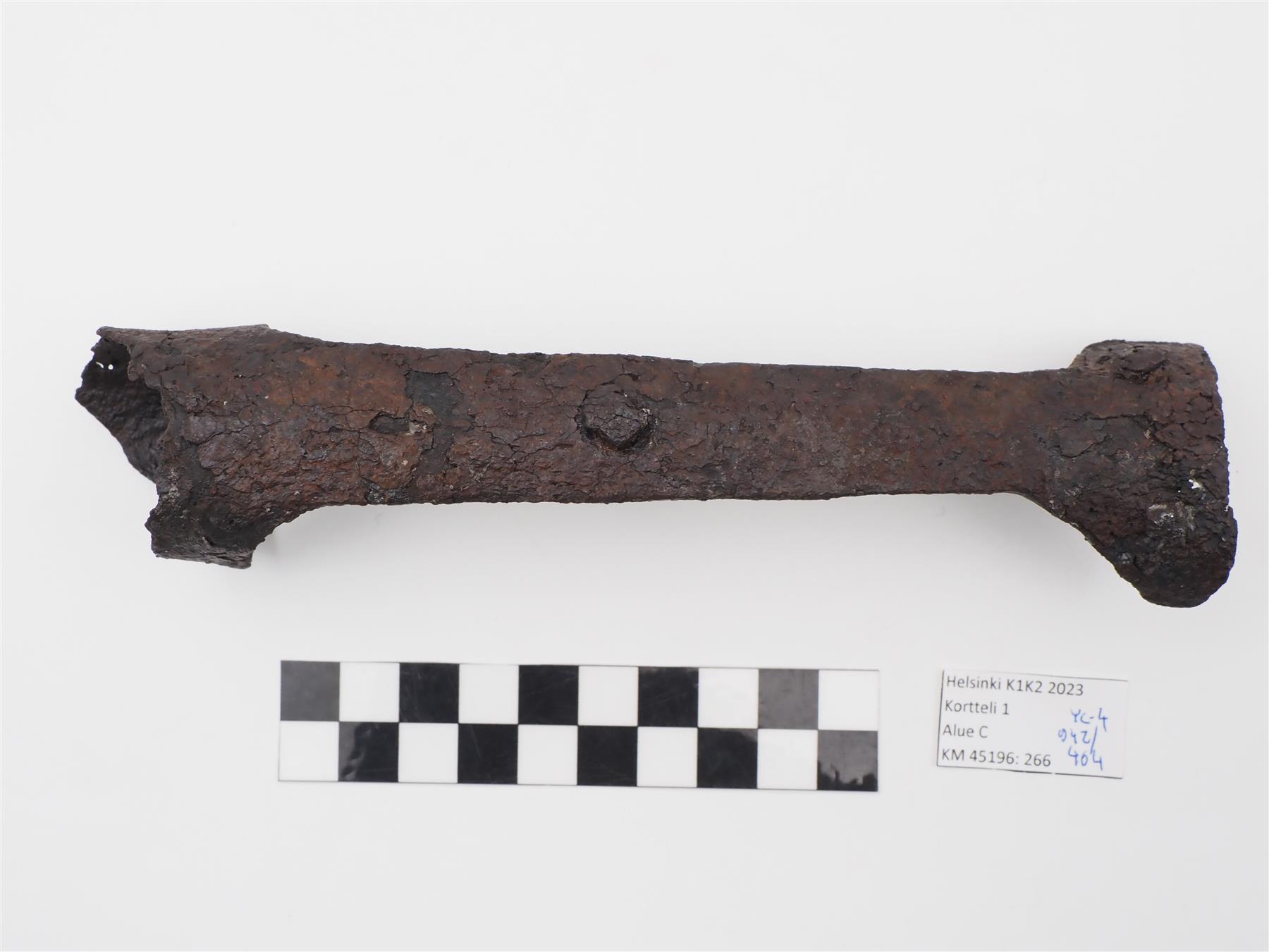 | Puuvartisen työkalun tai aseen varren metalliosa. Päässä lyhyt putkivartinen osuus, keskellä pitkä puuvarteen mennyt naula. Toisessa päässä kiinni hieman puuta varresta kahden naulan kohdalla. | |