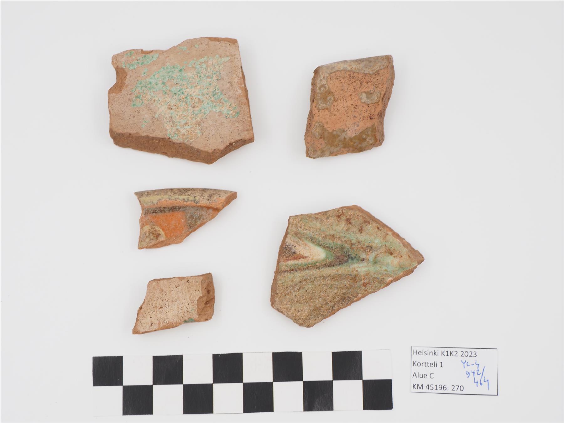 | 5 kpl punasaviastian paloja, toisella pinnalla kulunut vihreä lasite, jossa valkosavikuviointia | |