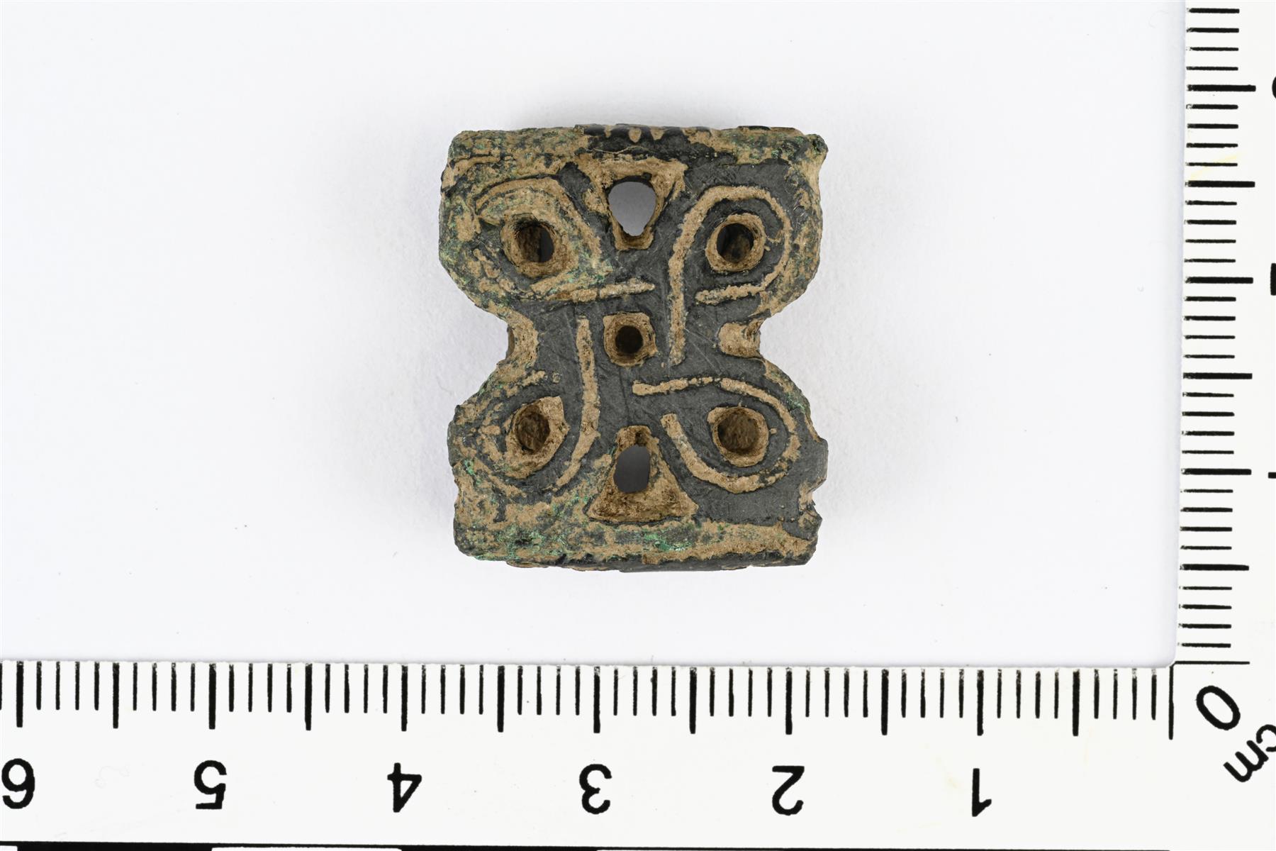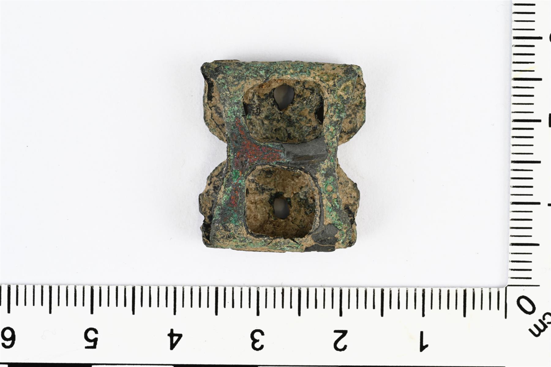 | Hannunvaakunalla koristettu vyönhela. Litteän ja putkimaisen suorakaiteen muotoinen. Taustapuolen levyssä on kaksi reikää. | |