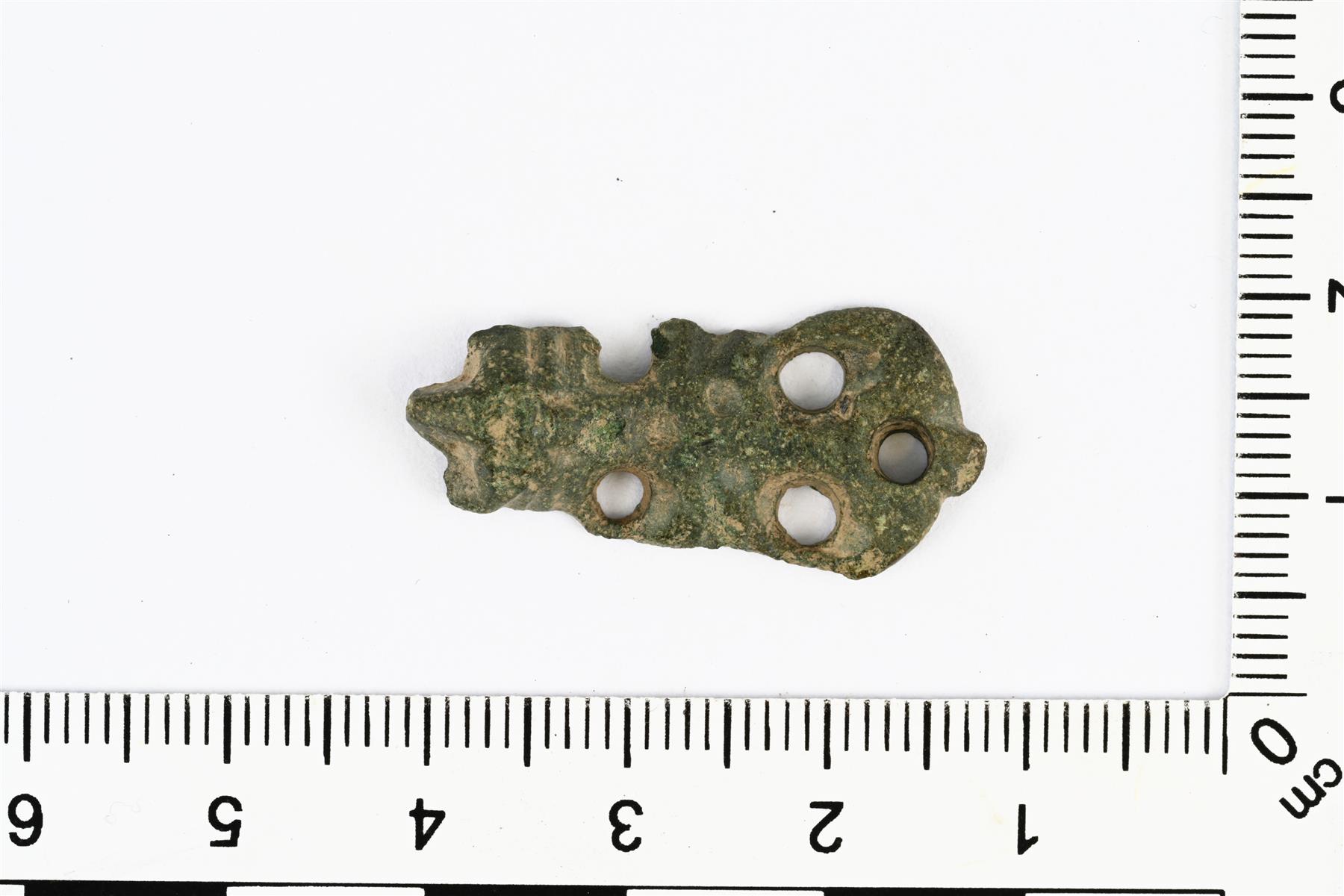 | Eläinpäisen hihnanjakajan helan katkelma. Koristeluna pyöreitä reikiä. Vrt. Kivikoski Abb. 893. | |