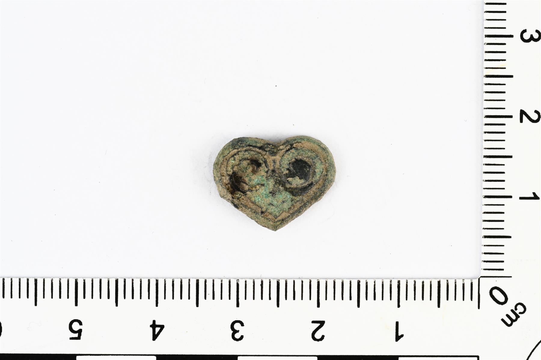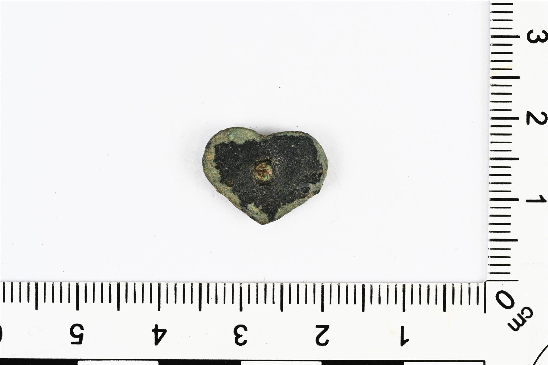 | Sydämenmuotoinen vyön koristehela. Taustapuolella on jäljellä niitin tyviosa. Vrt. Kivikoski Abb. 909. | |