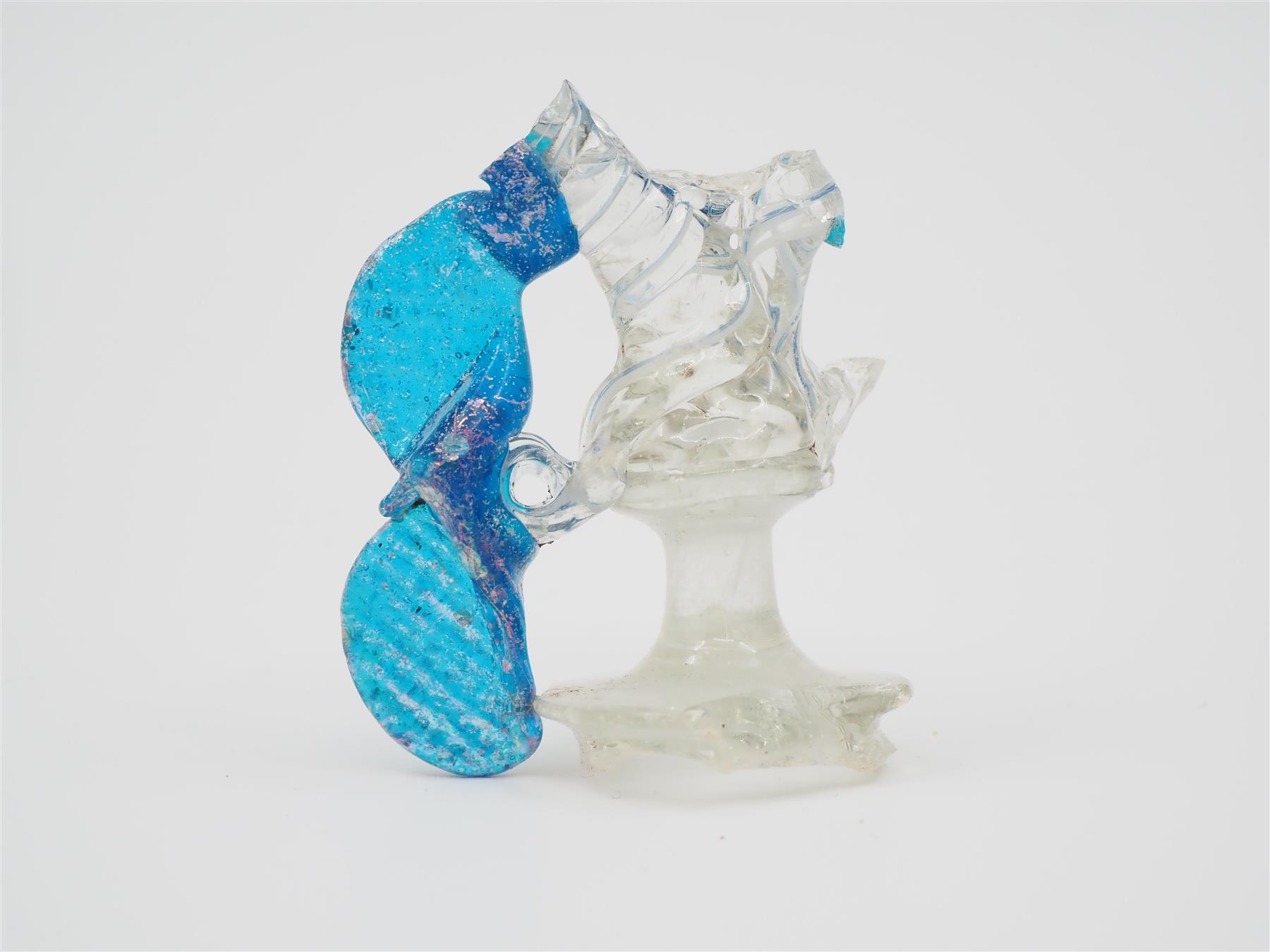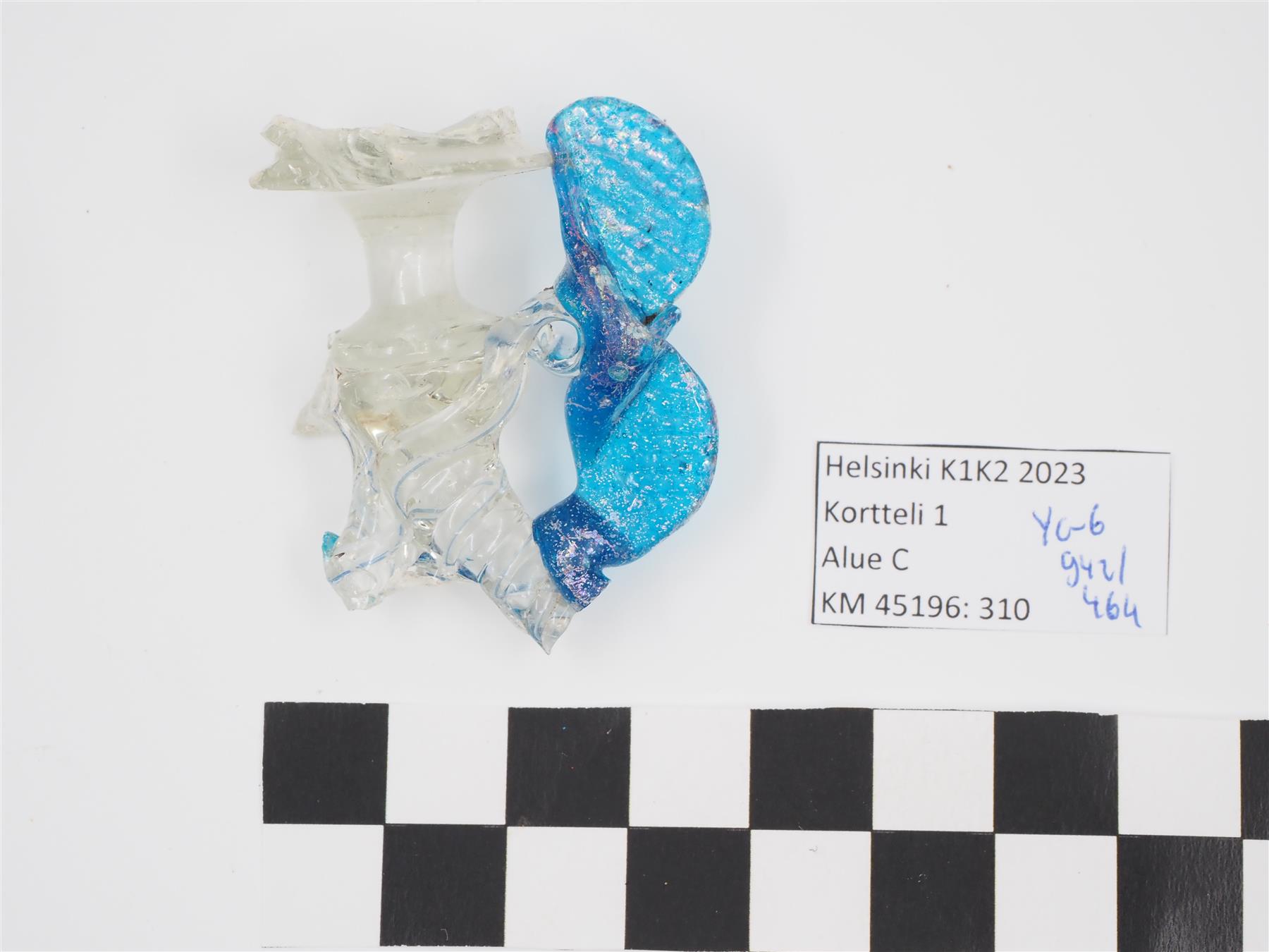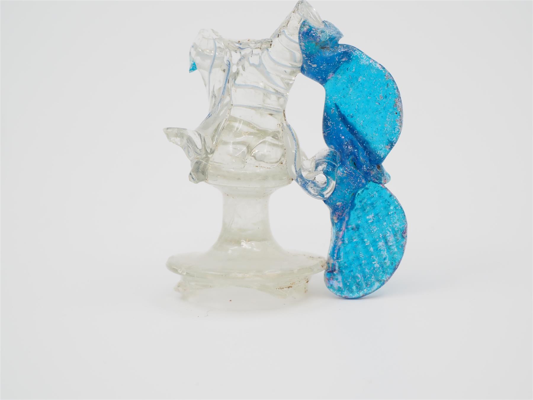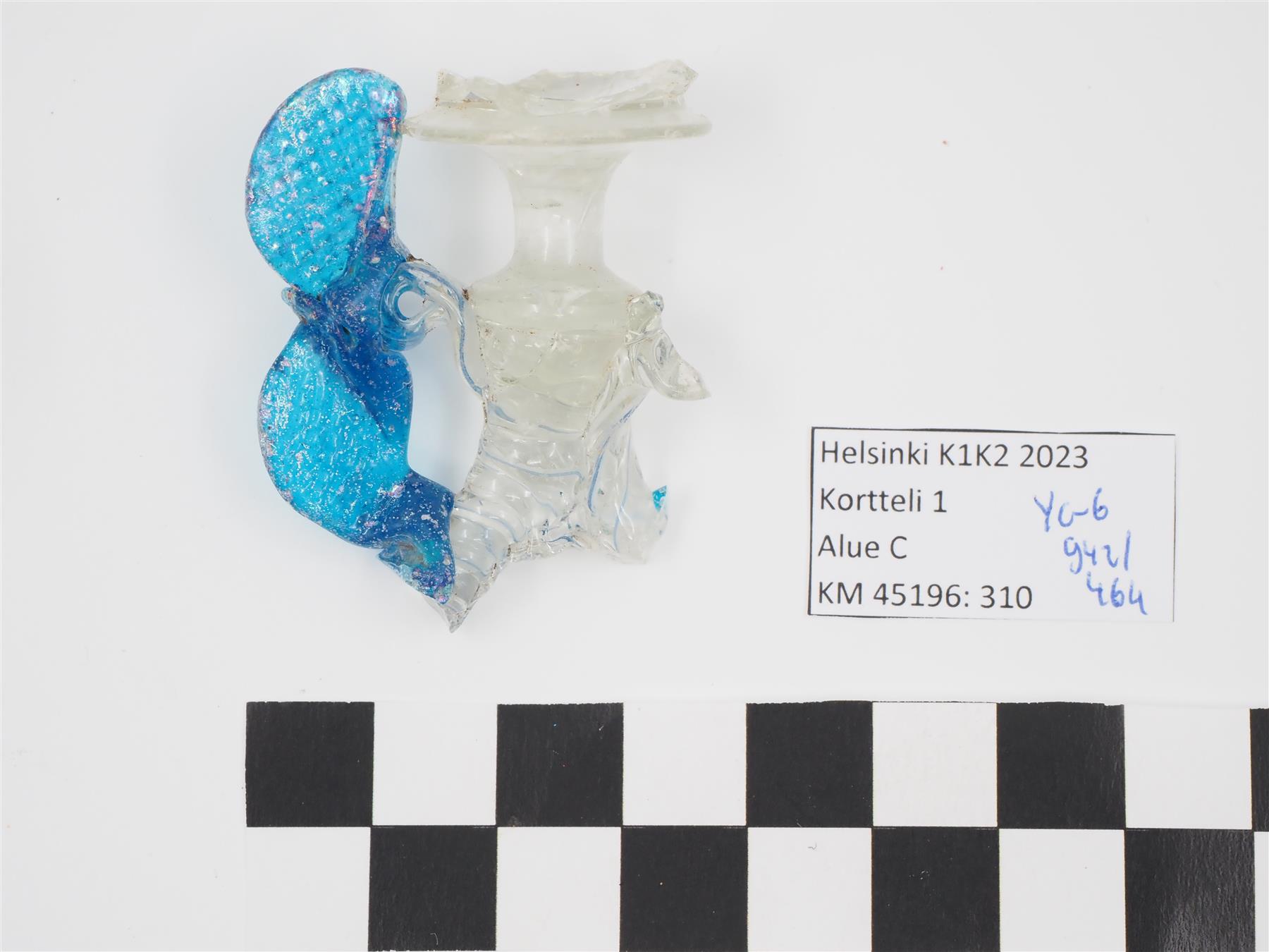 | Venetsialaistyylisen (façon de Venise) lasipokaalin varren kappale. Keskiosa pääosin väritön, nähtävissä hieman hienoa sinistä filigraanikuviointia. Sivulla kaksi sinisestä lasista tehtyä siipeä. | |