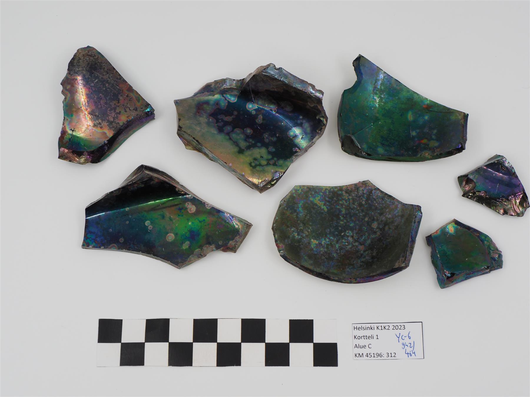 7 kpl vihreän lasipullon kappaleita, pinta iridisoitunut | |