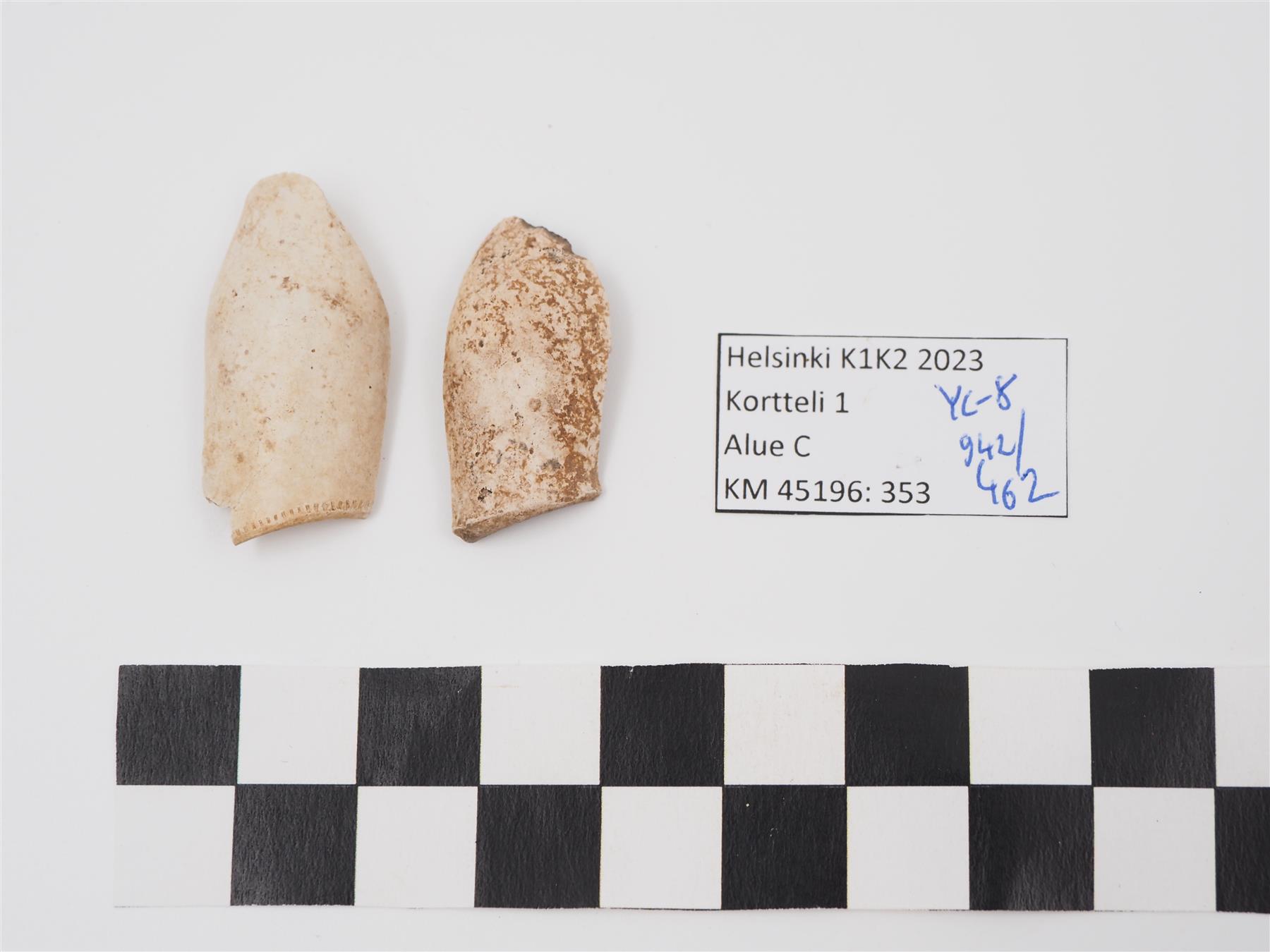 | 2 kpl liitupiipun pesän kylkiä, toisen suureunassa pisteviivaornamenttia | |