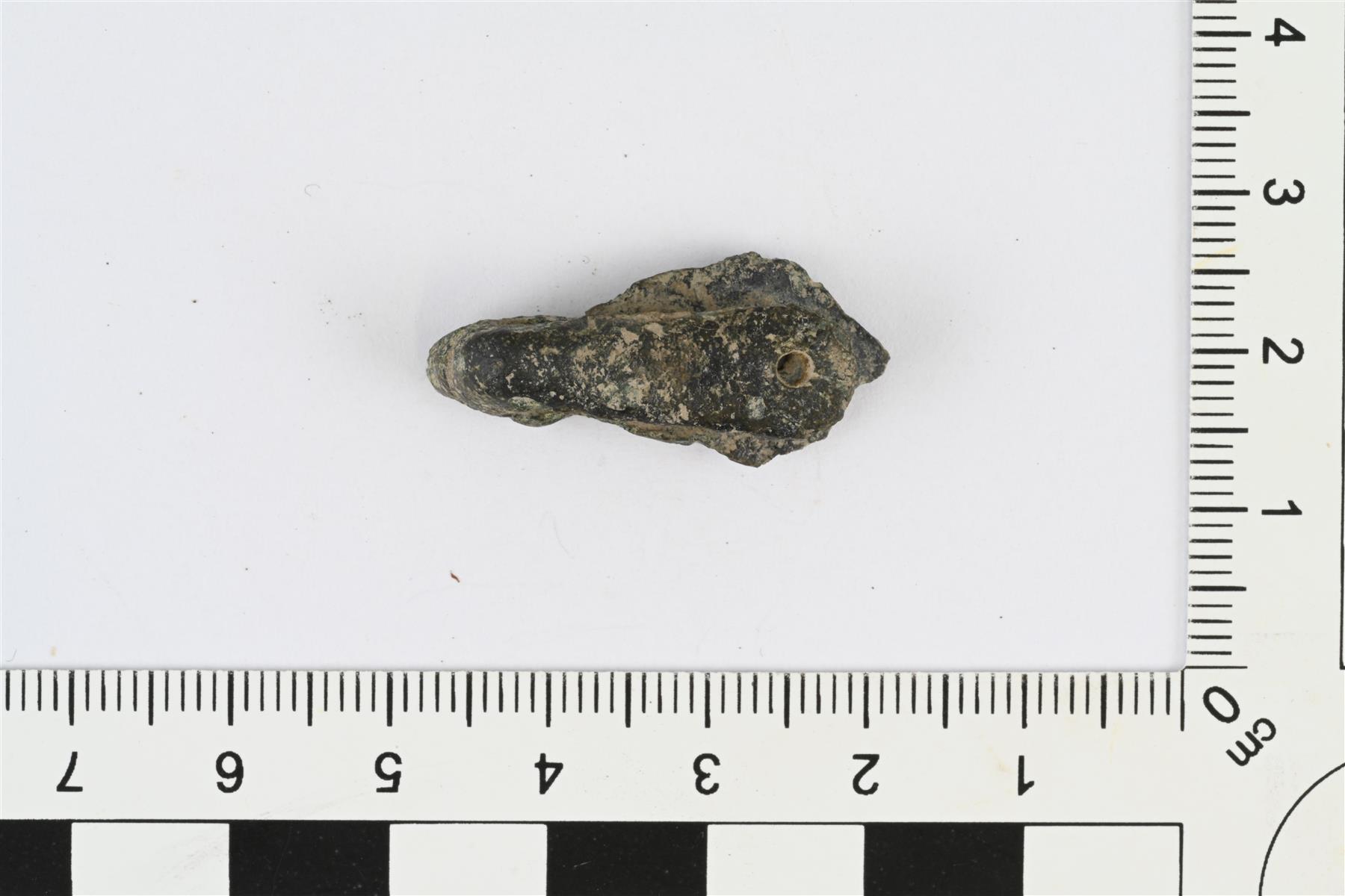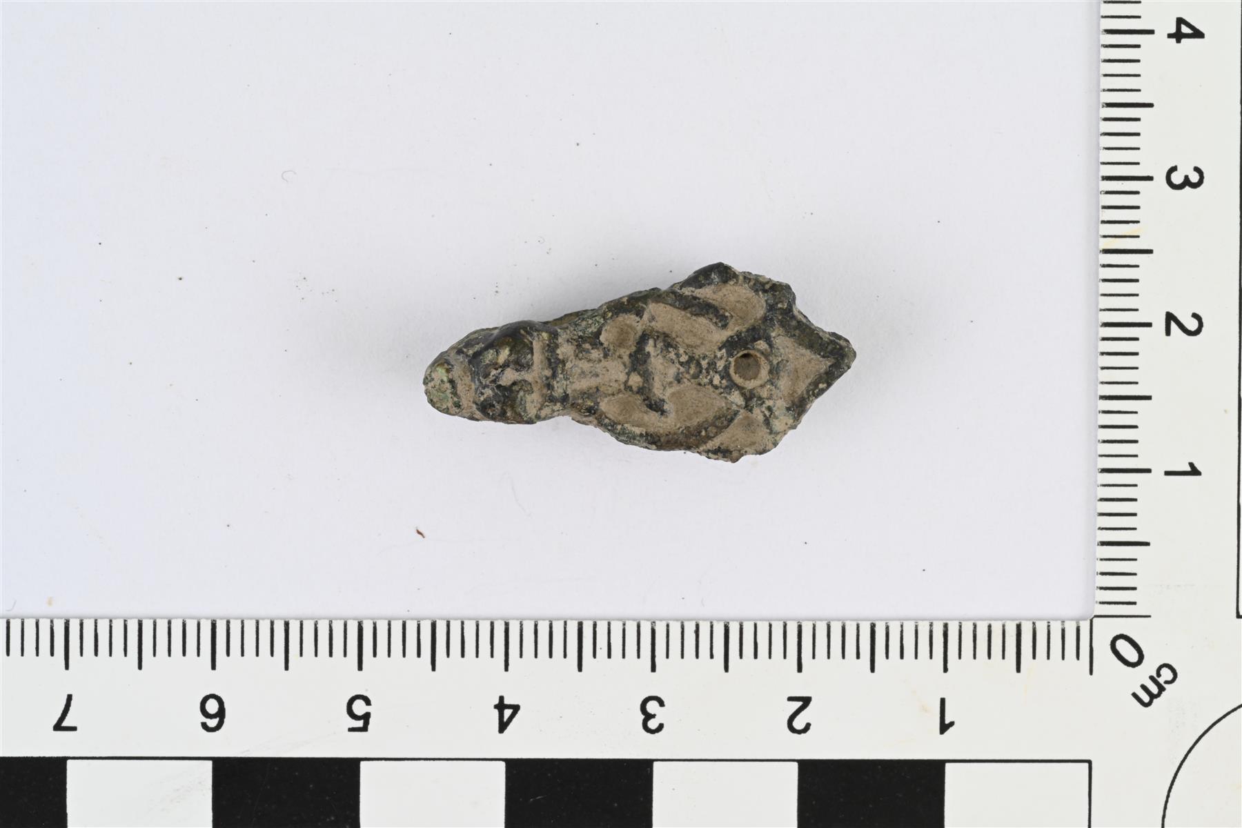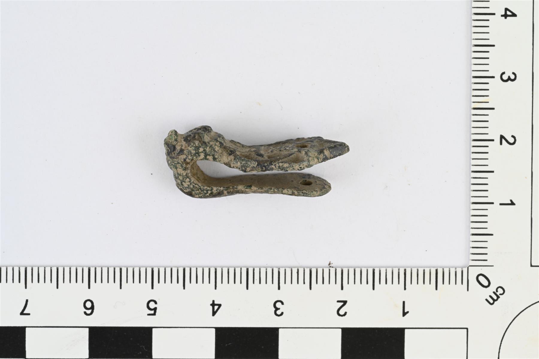 | Eläinpäinen hihnanjakajan hela. Etupuolella nauhapunosmaista reliefikoristelua ja kuoppia, eläimenpää kuvattu hyvin tyylitellysti. Etupuolen levy vääntynyt kohti taustapuolta. Molempien levyjen päissä pyöreä reikä. | |
