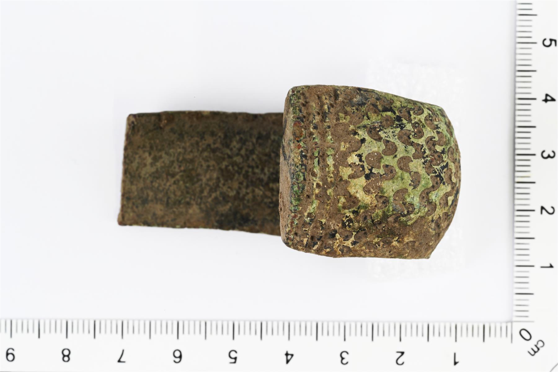 | Massiivisen rannerenkaan puolikas. Poikkileikkaus on etupuolelta kupera ja taustapuolelta suora. Päädyssä on kolme poikittaista viivauurretta ja tämän jälkeen alkaa D-kirjaimen muodostamien leimakuvioiden kenttä. Leimojen sisäpuolella on kolme kohopistettä. Kapein kohta on koristeltu häränsilmäleimojen muodostamilla viivoilla. Koristekentän ja häränsilmäleimojen välissä on kolme poikittaista viivauurretta. Vrt. Kivikoski Abb. 734. | |