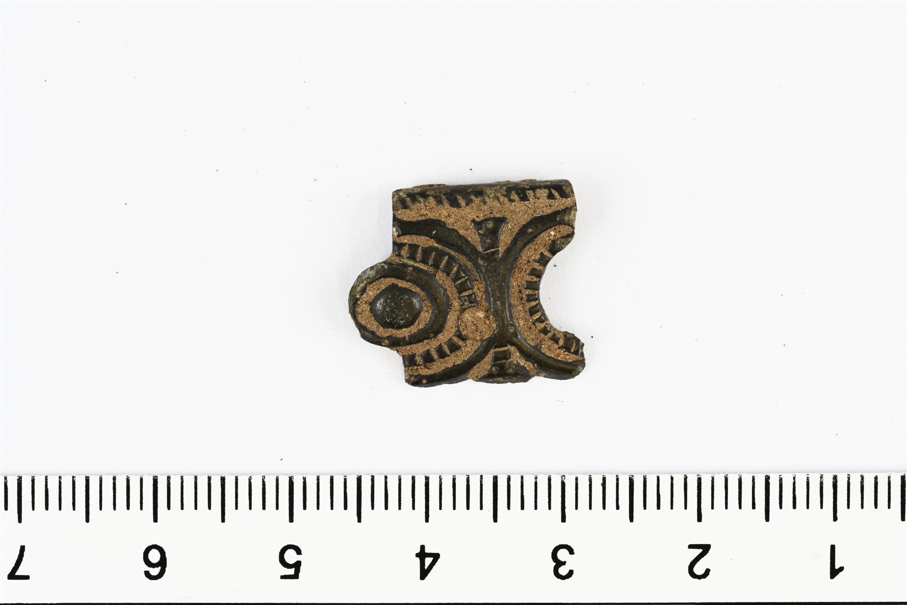 | Vyönhelan katkelma. Koristeluna kaksi rinnakkaista ympyräkuviota, jossa kohoviivoissa on myös helmikoristelua. Vrt. Kivikoski Abb. 928. | |