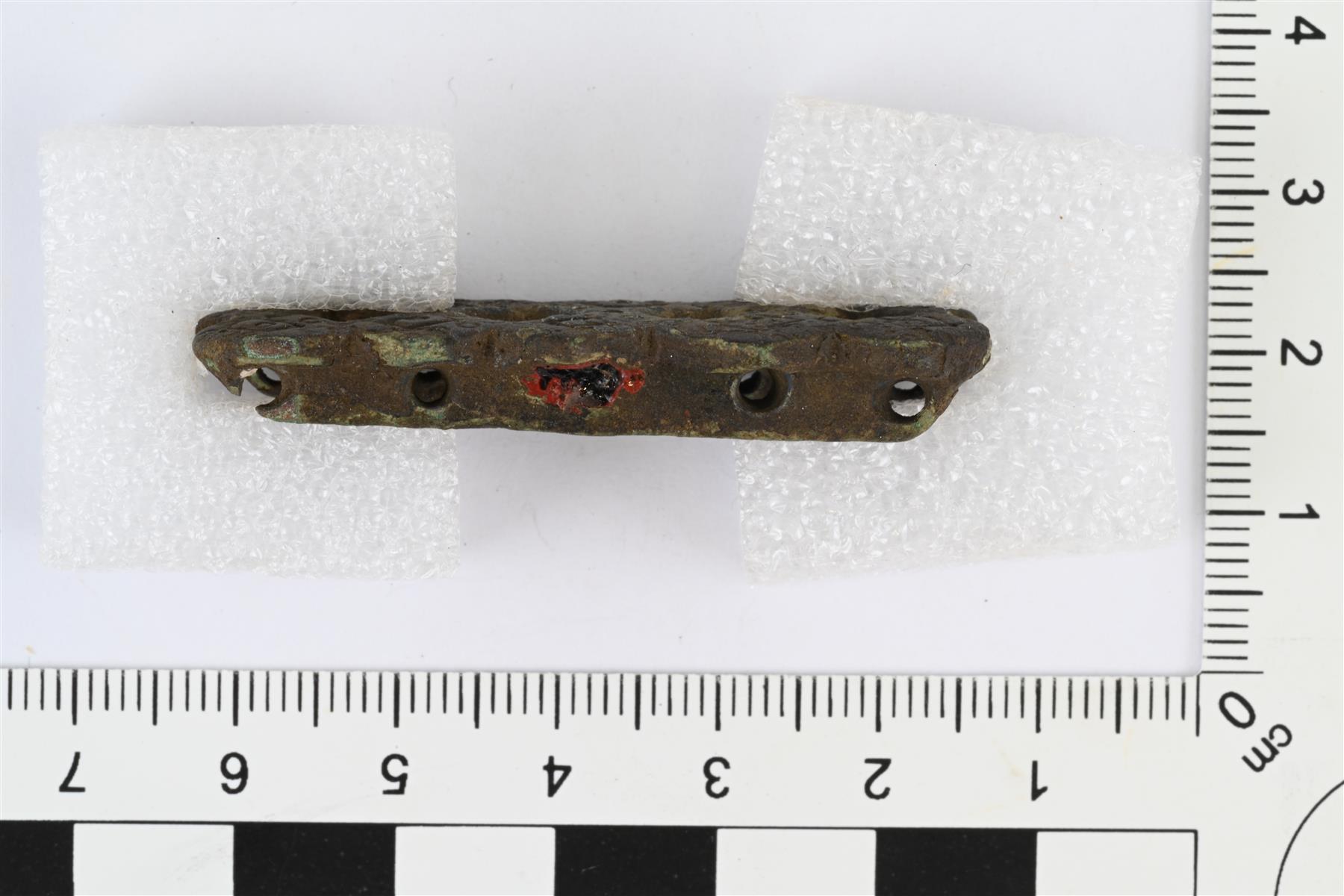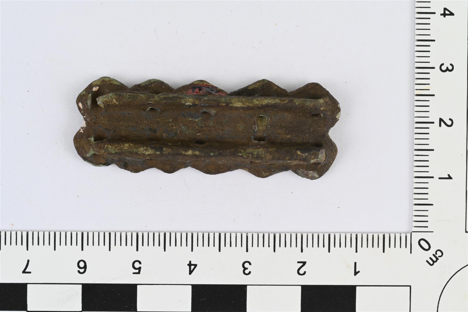 | Ketjun- tai helminauhanjakaja. Pitkänomainen. Etupuolen muodostaa koristeltu levy, jossa on ympyräkuvioin koristeltuja vinoneliöitä kahdessa päällekkäisessä rivissä, viisi vinoneliötä kummassakin rivissä. Vinoneliöiden väleihin jää vinoneliön muotoiset kuopat. Taustapuolella kaksi pitkittäistä kiskoa, joissa kummassakin viisi reikää vinoneliöiden kärkien kohdalla. Yhteen reikään sulanut kiinni ilmeisesti lasia, mahdollisesti helmestä. | |
