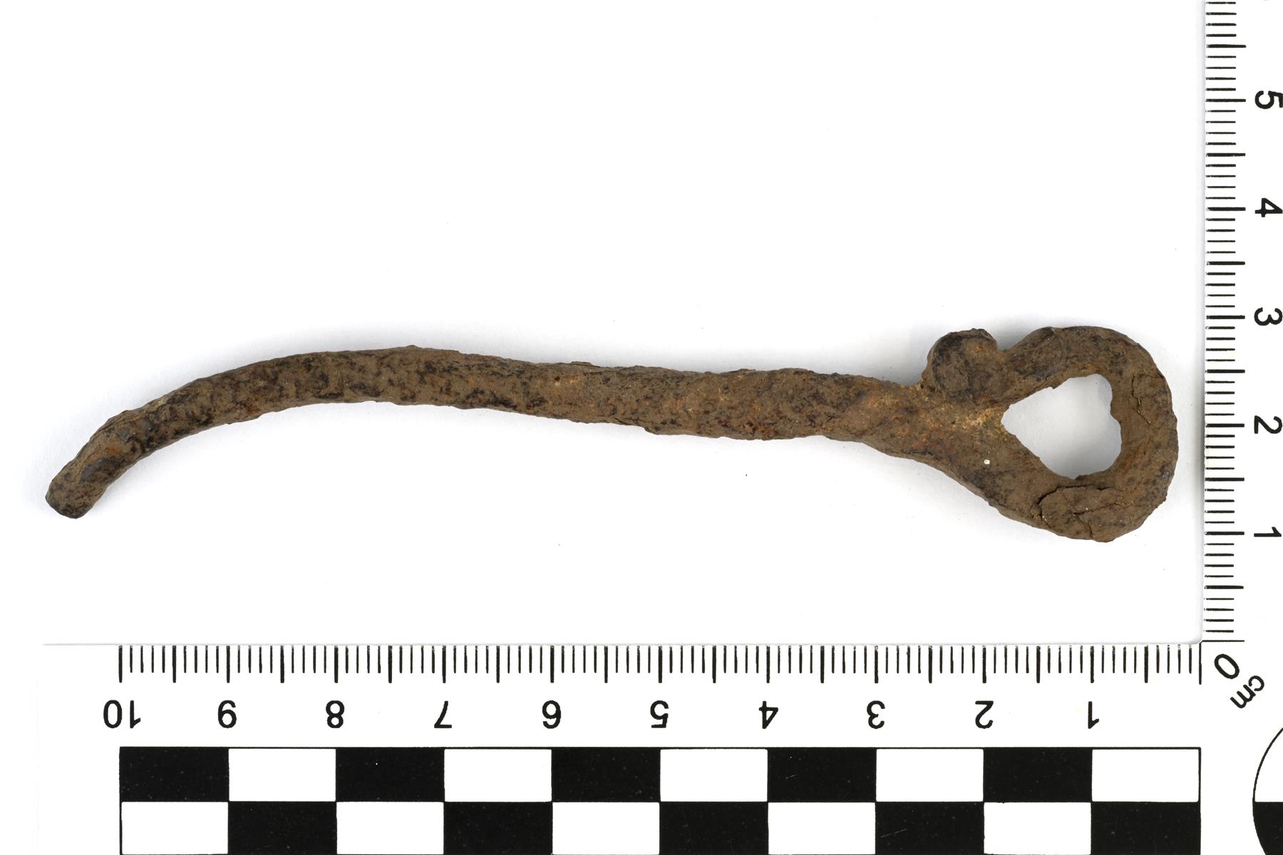 | Rautainen paimensauvaneula tai kuontalopuikko. Pää on taivutettu lenkille ja pääty on kierretty. Neulan yläosassa on kierteitä. Alaosa on hieman taivutettu. | |