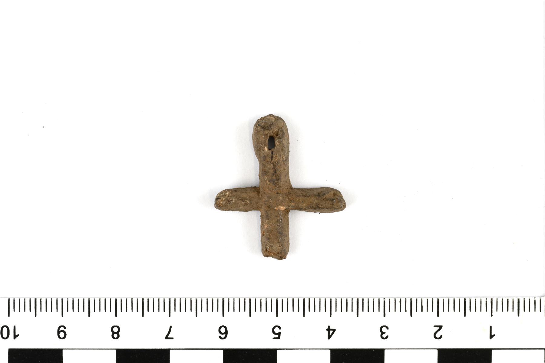 | Tasavartinen risti. Melko karkeaa tekoa. Yläpäässä on pieni reikä ripustusta varten. | |