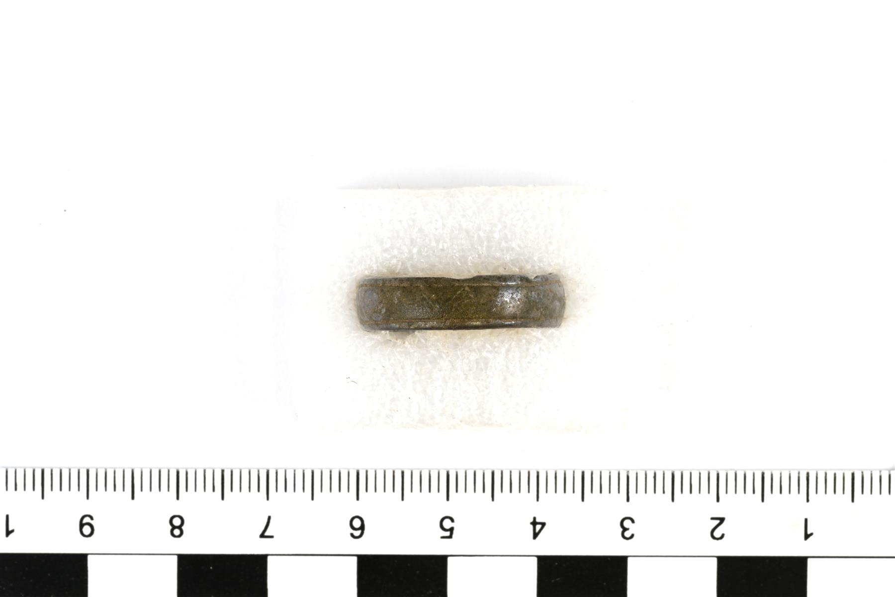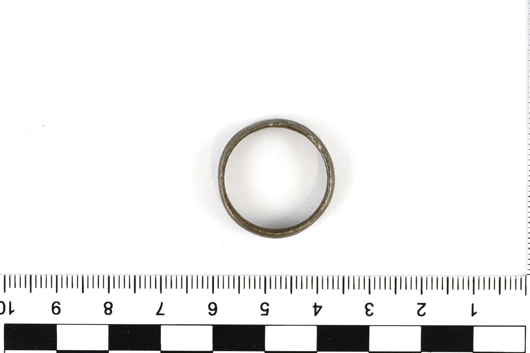 | Tasaleveä umpisormus. Ulkopinta on hieman kaareva ja siinä on koristeena kaiverrettua siksak-kuviointia. Tehty valamalla, sisäpinnassa on sauman jälkiä | |