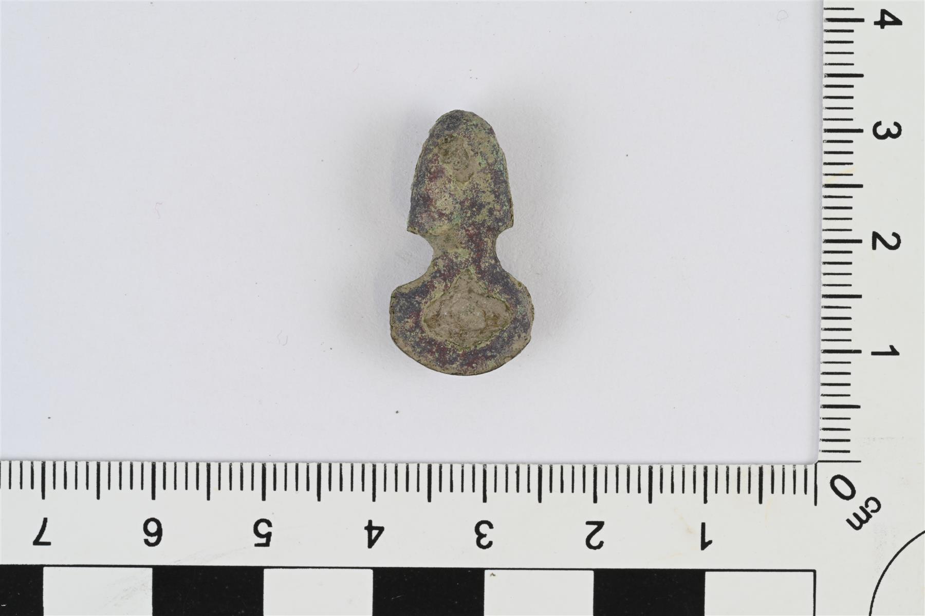 | Kupariseosesine. Pieni ja pitkänomainen, etupuolelta kupera ja taustapuolelta tasainen ja osittain kovera. Toinen pää levenevä, toinen pää suippeneva, esineen keskivaiheilla sivuissa koverat kavennukset. | |