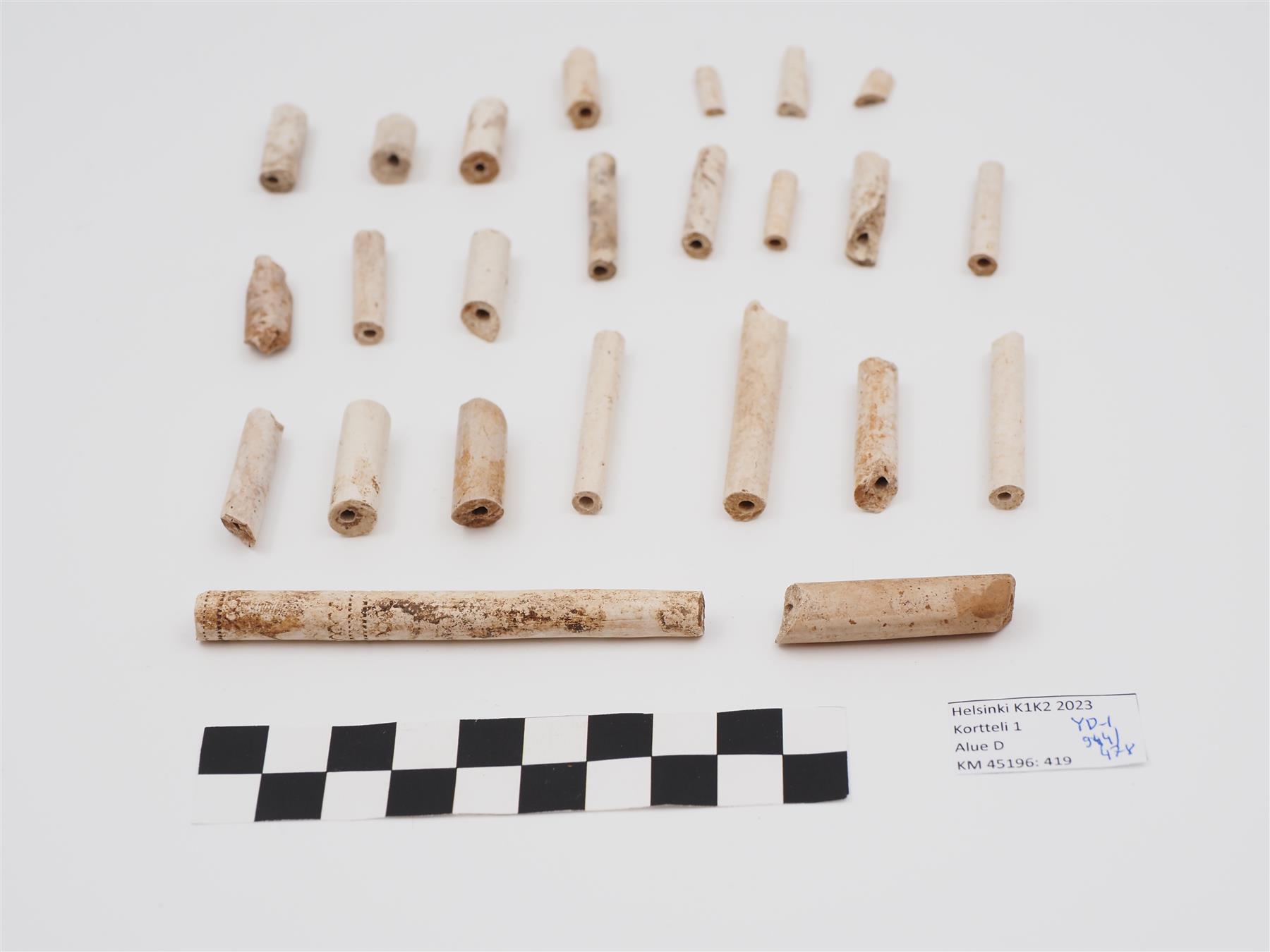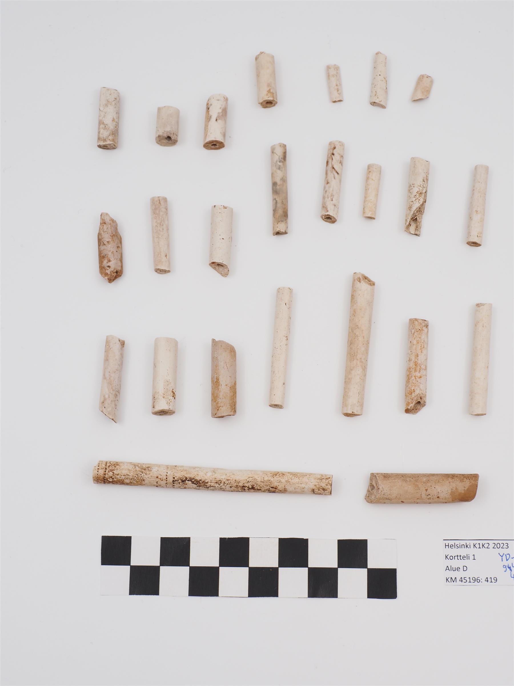 | 24 kappaletta liitupiippujen varsia, pisimmässä kappaleessa pisteviiva- sekä ympyräornamentteja. | |