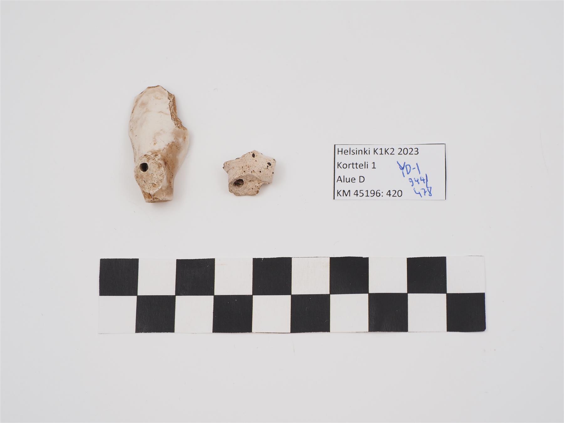 | Kaksi liitupiipun kantaa, toisessa kiinni osa pesästä. Ei koristelua. | |