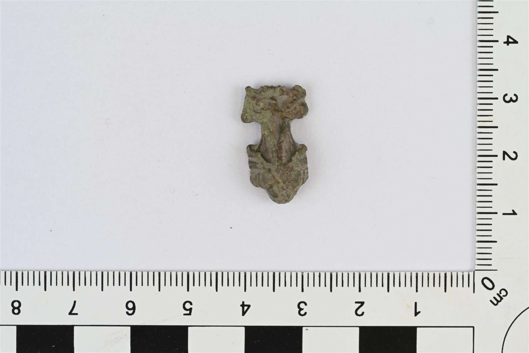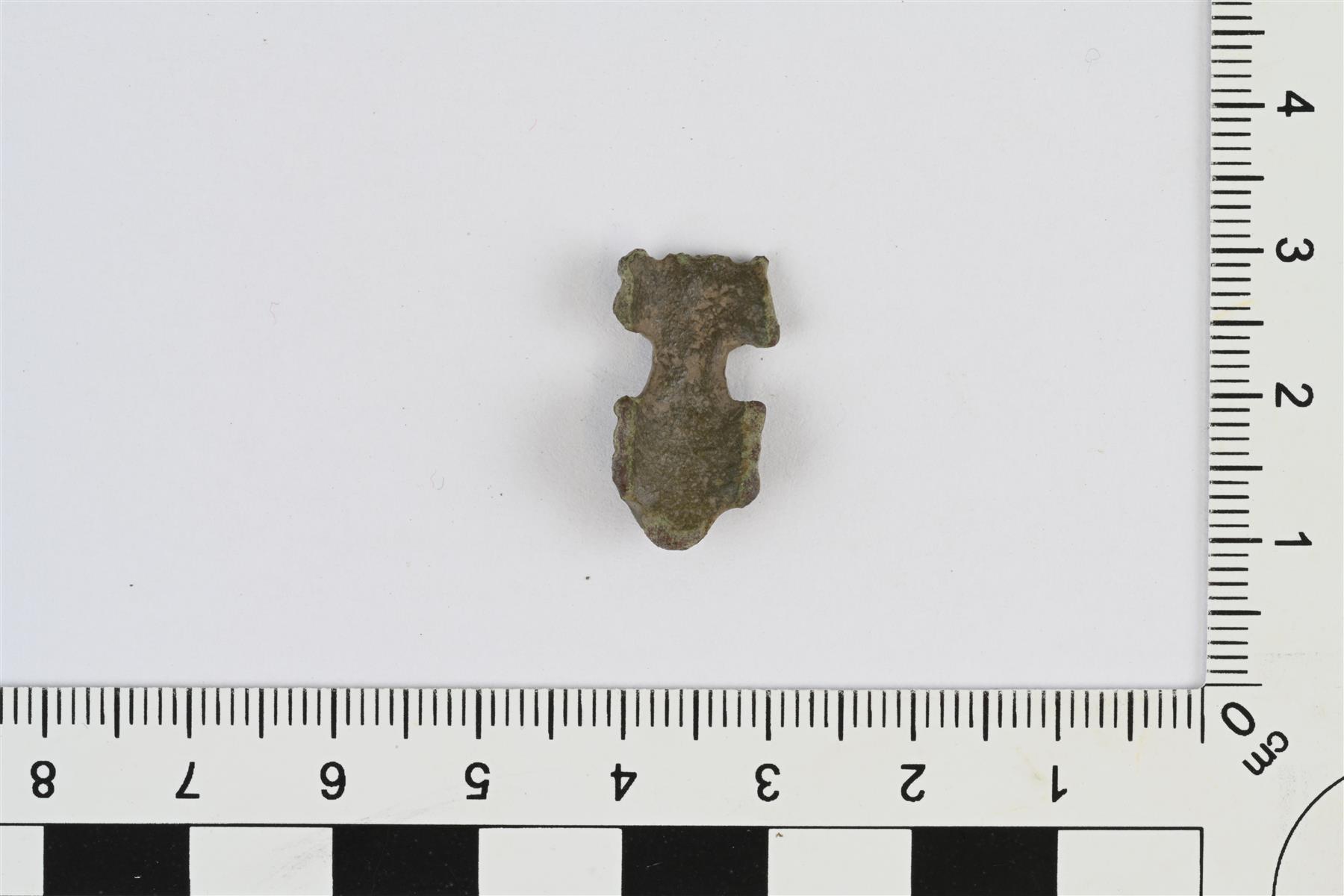 | Katkelma helasta tms. Pieni ja pitkänomainen, etupuoli kupera ja taustapuoli kovera. Etupuolella viivakoristelua. | |