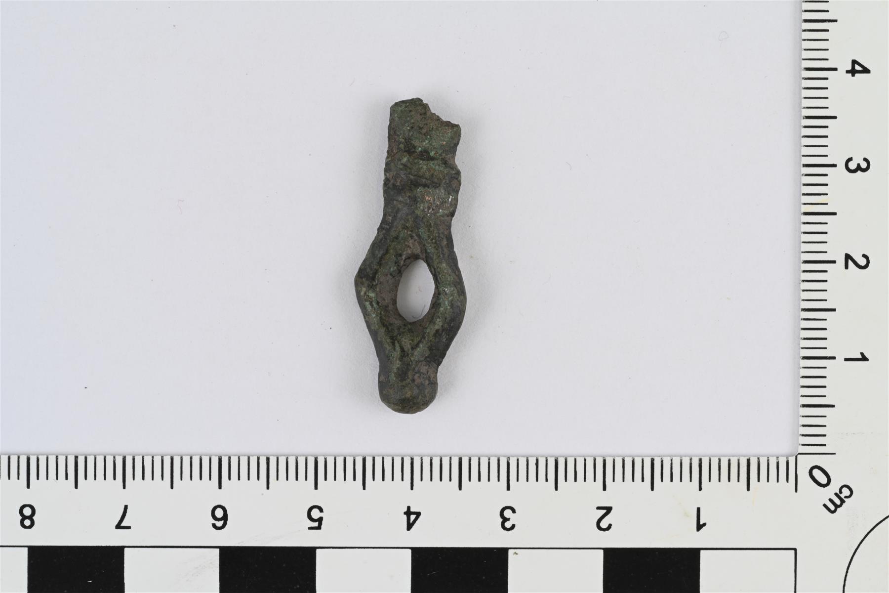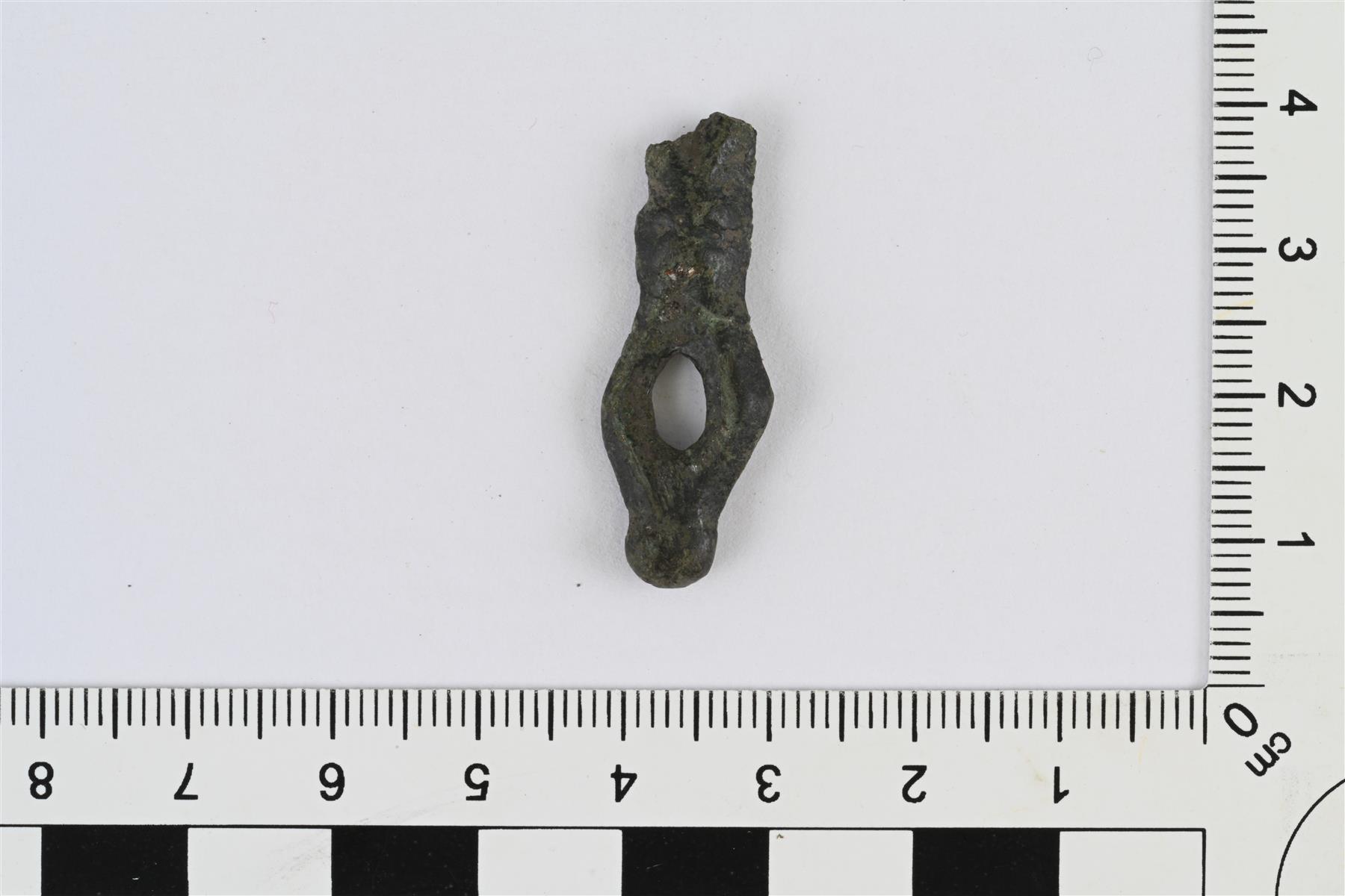 | Vyön päätehelan katkelma. Pitkänomainen ja litteähkö. Ehjässä päässä vinoneliön muotoinen levennys, jossa soikea reikä, ja päässä nuppi. Vinoneliöstä katkonaiseen päähän päin profiloitu. | |