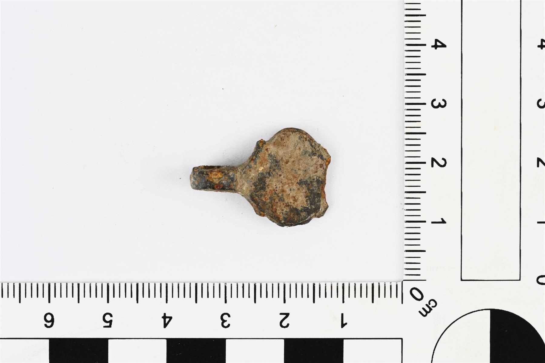 | Levymäisen hihnanjakajan helan katkelma. Päädyssä on lenkki ja taustapuolella on kiinnitysniitin jäänne. Koristeeton. | |