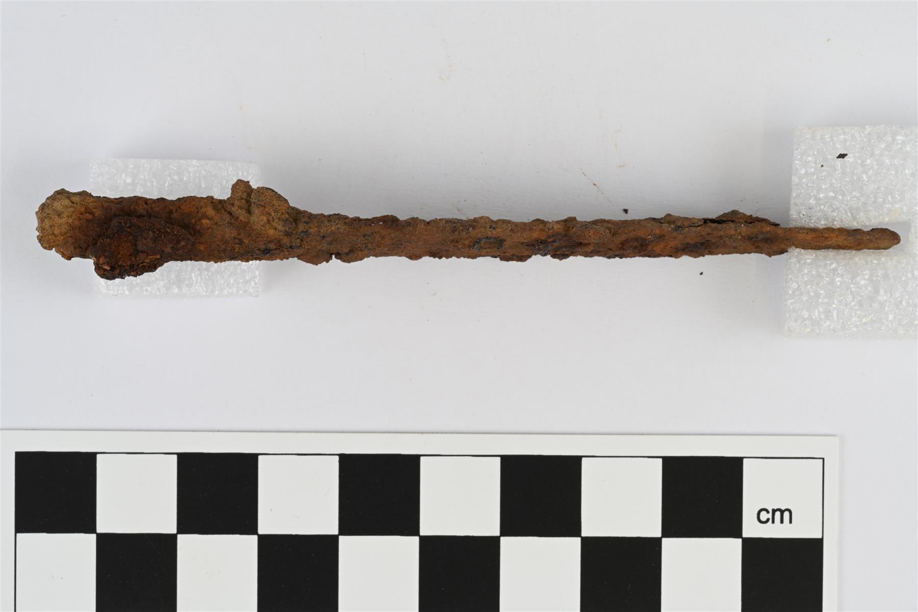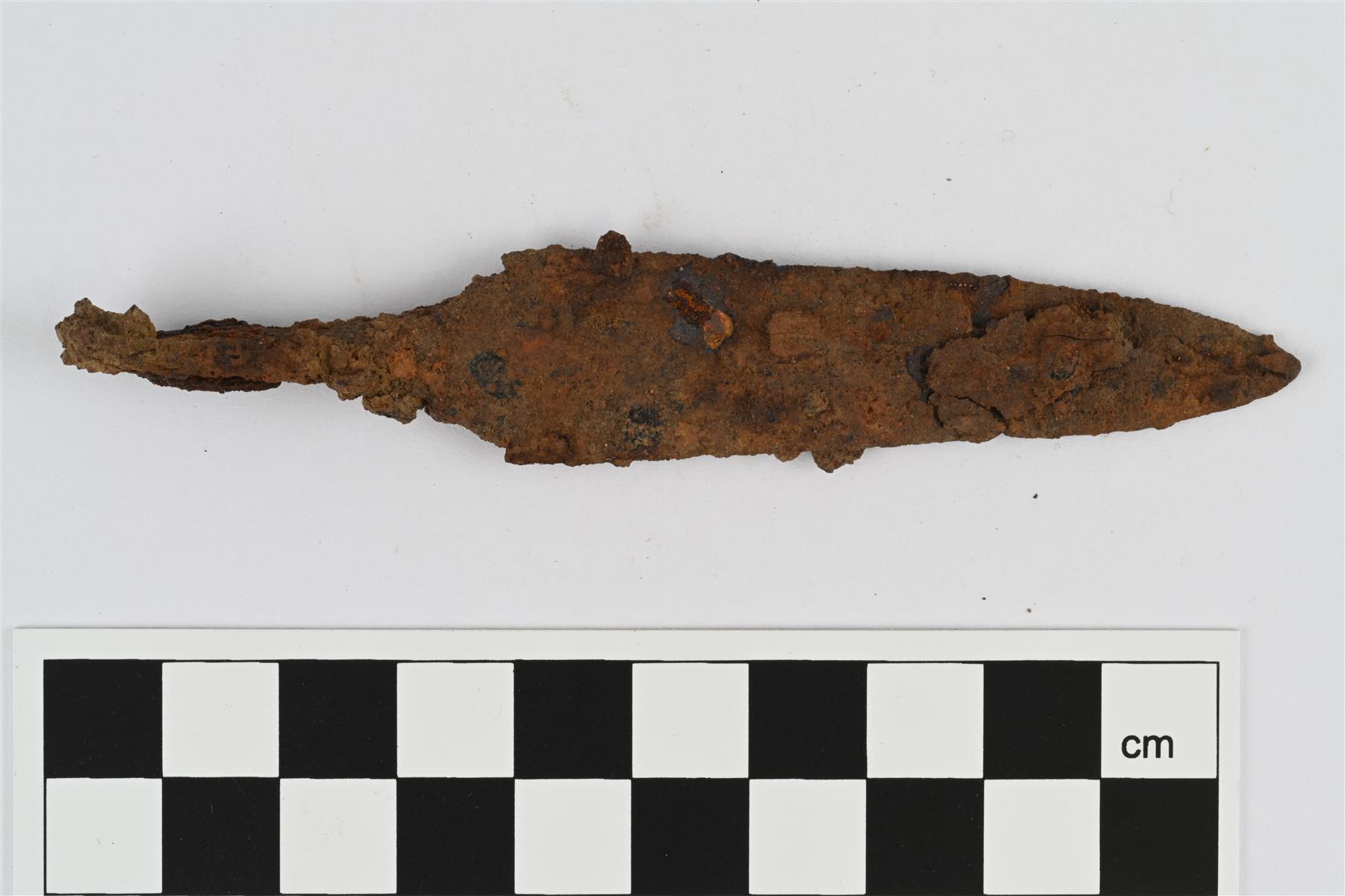 Ruodollinen nuolenkärki. Vastaa Hiekkasen (1979) tyyppiä 3BII. Pitkä ja kapea lehti, jonka levein kohta on lähellä ruotoa. Terän etuosan reunat hieman kuperat, tyviosan reunat koverat, ja näiden välissä on kulma. Lehti lähes litteä, toinen pinta hieman harjava. Ruoto on poikkileikkaukseltaan litteä 90 asteen kulmassa lehteen nähden. Ruodon pää mahdollisesti katkennut. | |