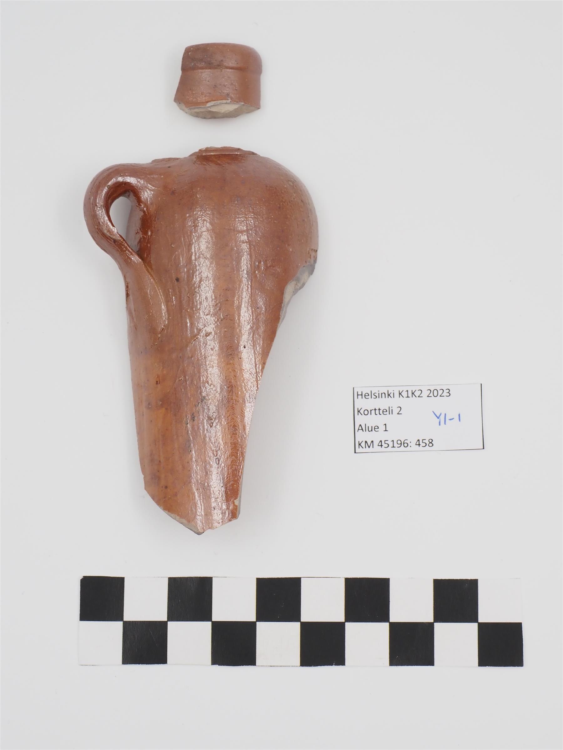 | Kivisavisen seltteripullon kylki sekä pieni pala pullon suusta. Kyljessä murtumakohdassa kolme kirjainta, joista ensimmäinen on F, kaksi seuraavaa epäselviä. Kyljessä kiinni kahva. Pinnalla ruskea lasite. | |