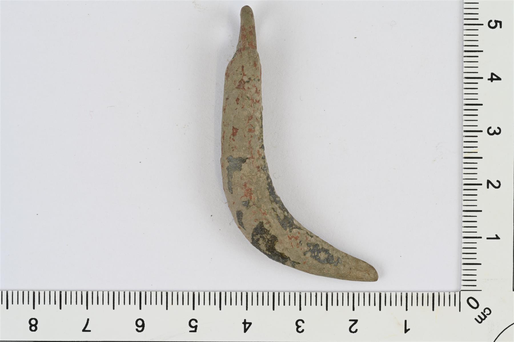 | Ehjä karhunhammasriipus. Yläpäässä suippokärkinen ripustuslenkki. Pinta kulunut. | |