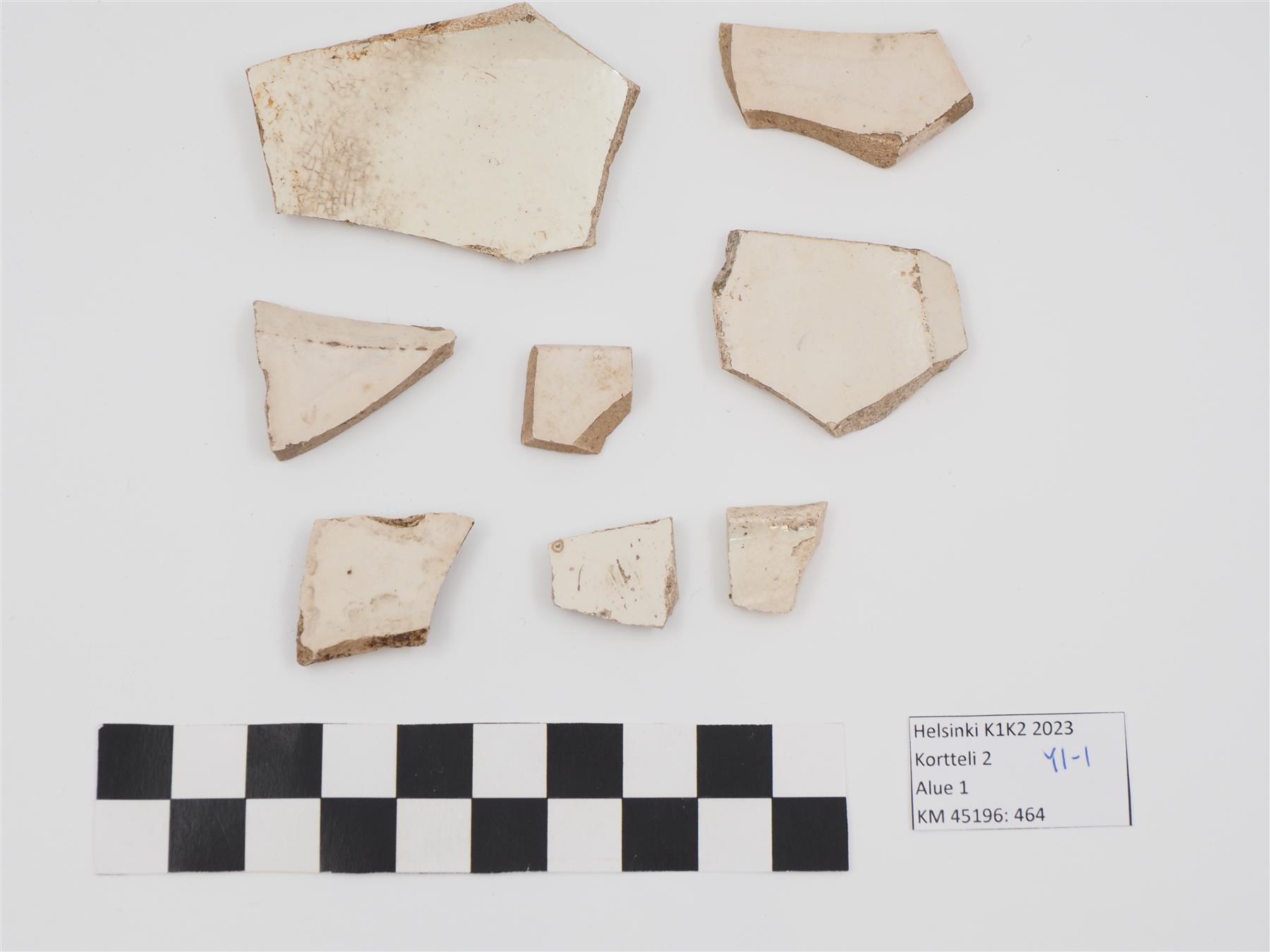 | 8 kpl piiposliinisen astian paloja, molemminpuolinen kermanvalkoinen tinalasite | |