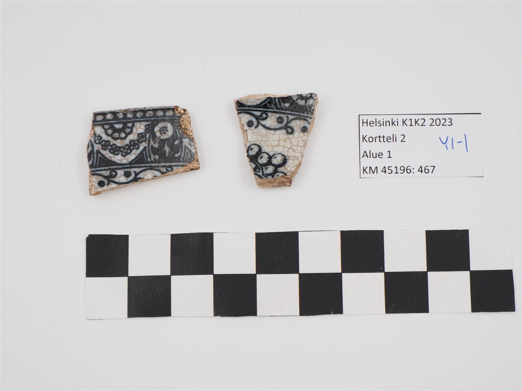 2 kpl piiposliinisen astian paloja. Molemmilla pinnoilla halkeillut valkoinen tinalasite, yläpinnalla mustaa siirtokuviointia. | |