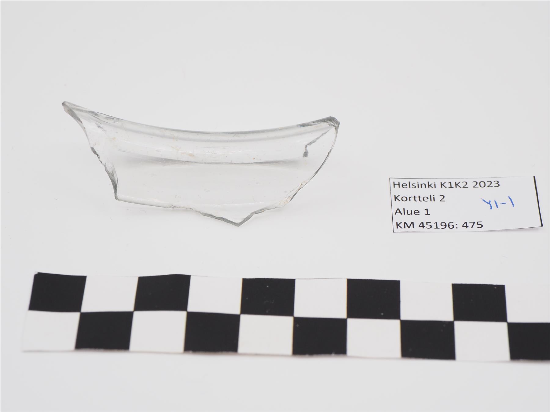 Värittömän lasiastian, mahdollisesti purkin, suureuna. Reuna taitettu ulospäin. | |