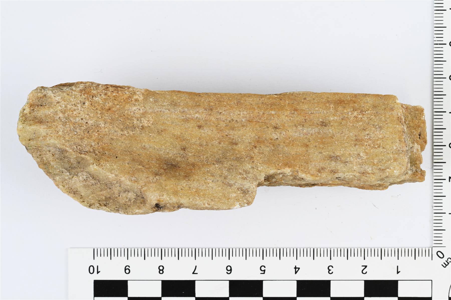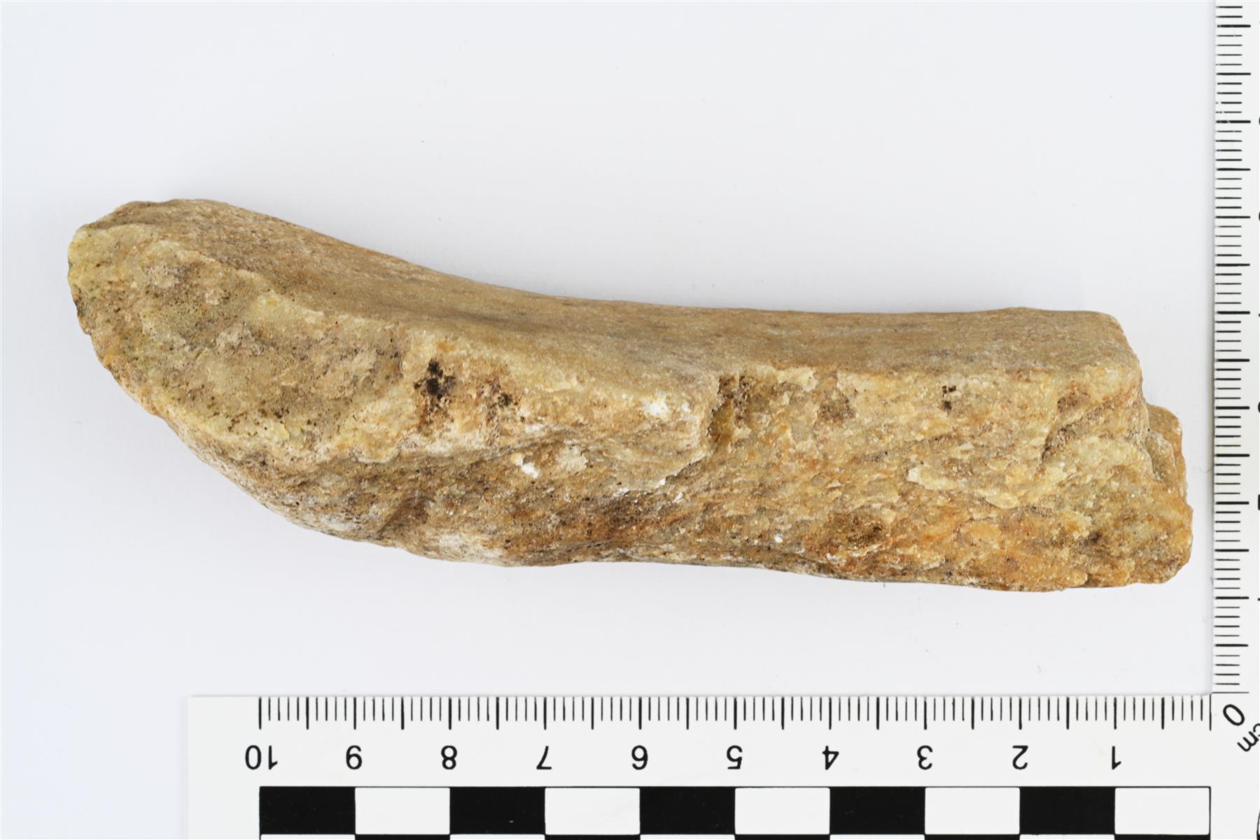 | Vaaleasta kvartsiitista tehdyn hiomakiven tai laakakiven katkelma. Yläpinta on kulunut voimakkaasti. | |