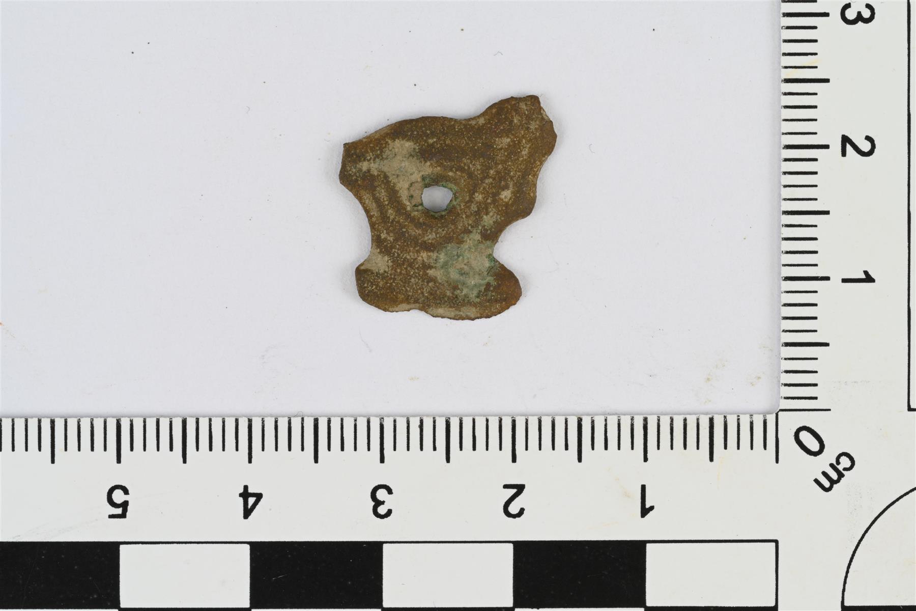 Pyöreän kupurasoljen pieni reunakatkelma. Vastaa luultavasti Appelgrenin C-tyyppiä. Katkelmassa yksi pieni pyöreä reikä. | |
