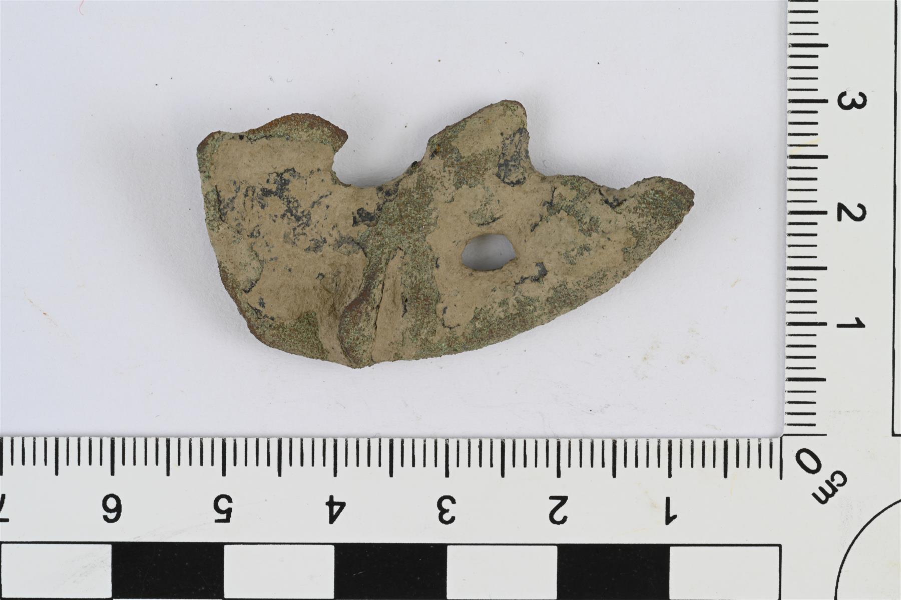 | Osittain sulanut pyöreän kupurasoljen reunakatkelma. Katkelmassa yksi reikä. Taustapuolella neulakodan jäänne. | |