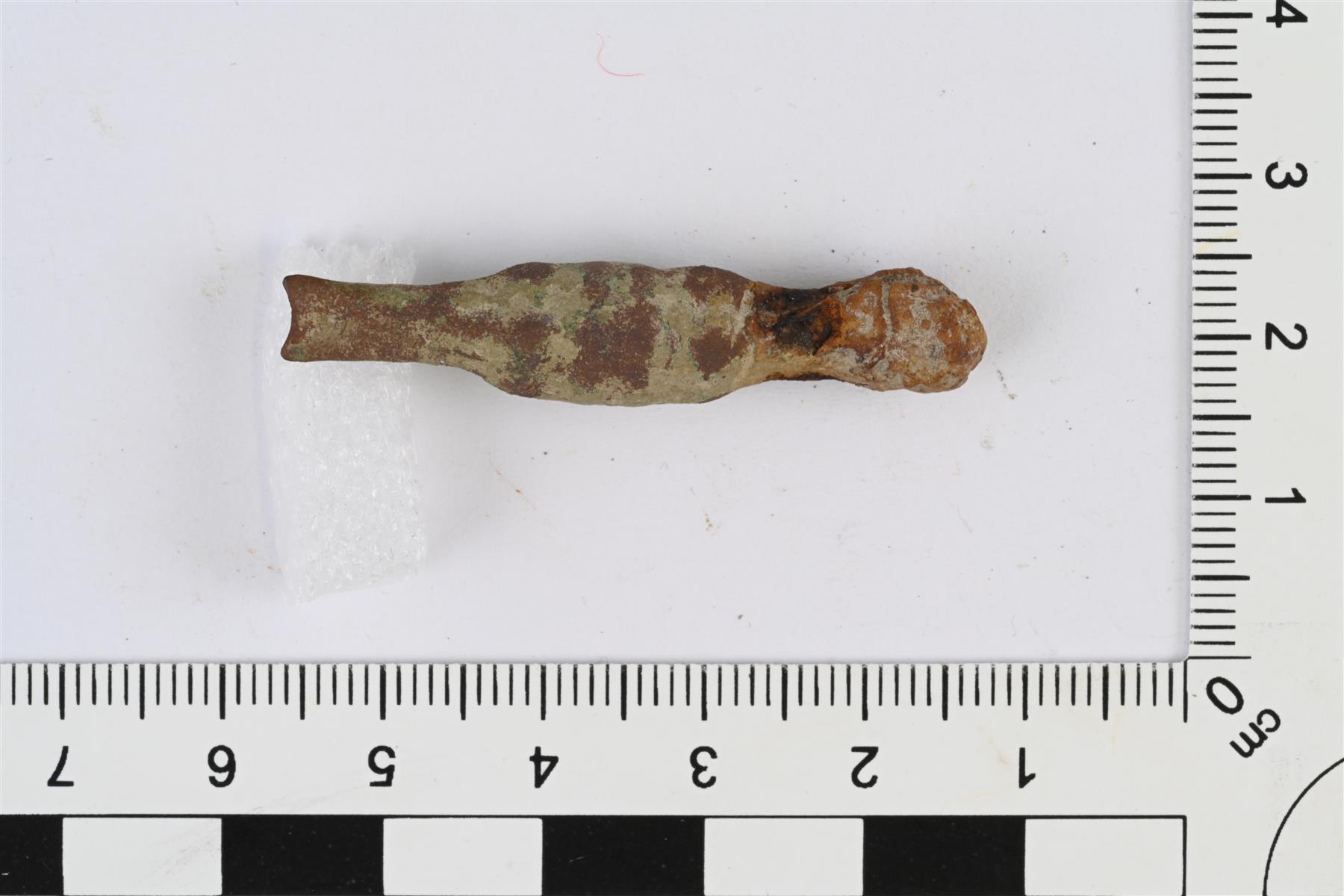 Koruneulan pään katkelma. Kupariseoksisessa päässä pyöristetyn nelikulmainen paksunnos, jossa poikkiuria. Paksunnoksen yläpuolella litteä venyvä osa, joka katkennut lenkin kohdalta. Paksunnoksen toisessa päässä rautaisen neulan jäänne. | |
