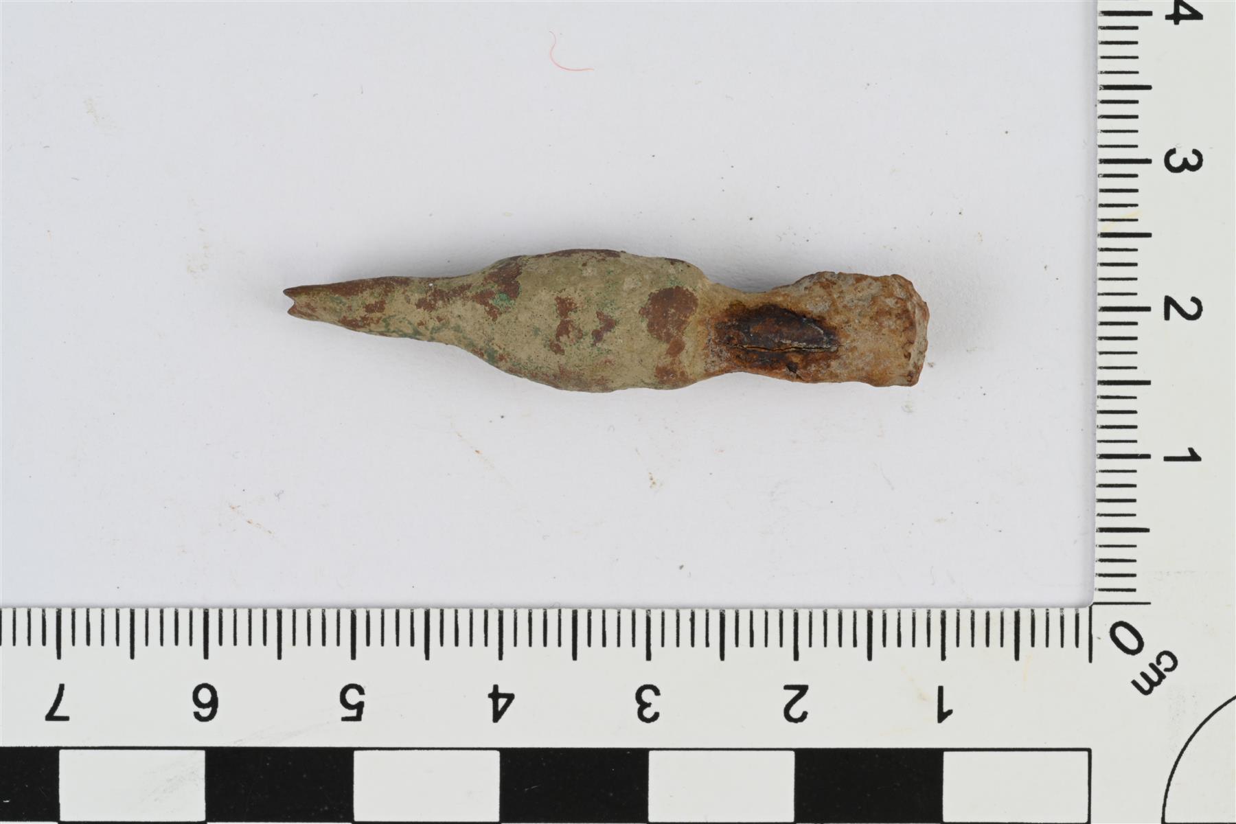 | Koruneulan pään katkelma. Kupariseoksisessa päässä pyöristetyn nelikulmainen paksunnos, jossa poikkiuria. Paksunnoksen yläpuolella litteä venyvä osa, joka katkennut lenkin kohdalta. Paksunnoksen toisessa päässä rautaisen neulan jäänne. | |