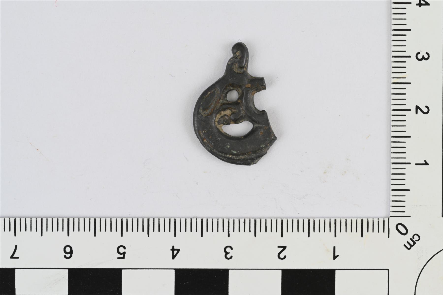 Litteän puhkonaisen esineen, luultavasti riipuksen katkelma. Kiemuraista, Urnes-tyyliä muistuttavaa koristelua, josta hahmottuu tyylitelty kasvin oksa ja lehti. | |