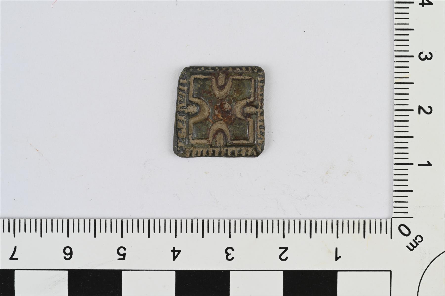 Neliönmuotoinen vyönhela, ns. ruusukehela. Etupuoli hieman kupera ja taustapuoli kovera. Keskellä rautainen kiinnitysniitti, joka näkyy myös esineen etupuolella. Etupuolella reliefikoristelua, jossa keskellä vinoristi ja reunoissa pienistä pystyviivoista koostuva koristeraita. | |