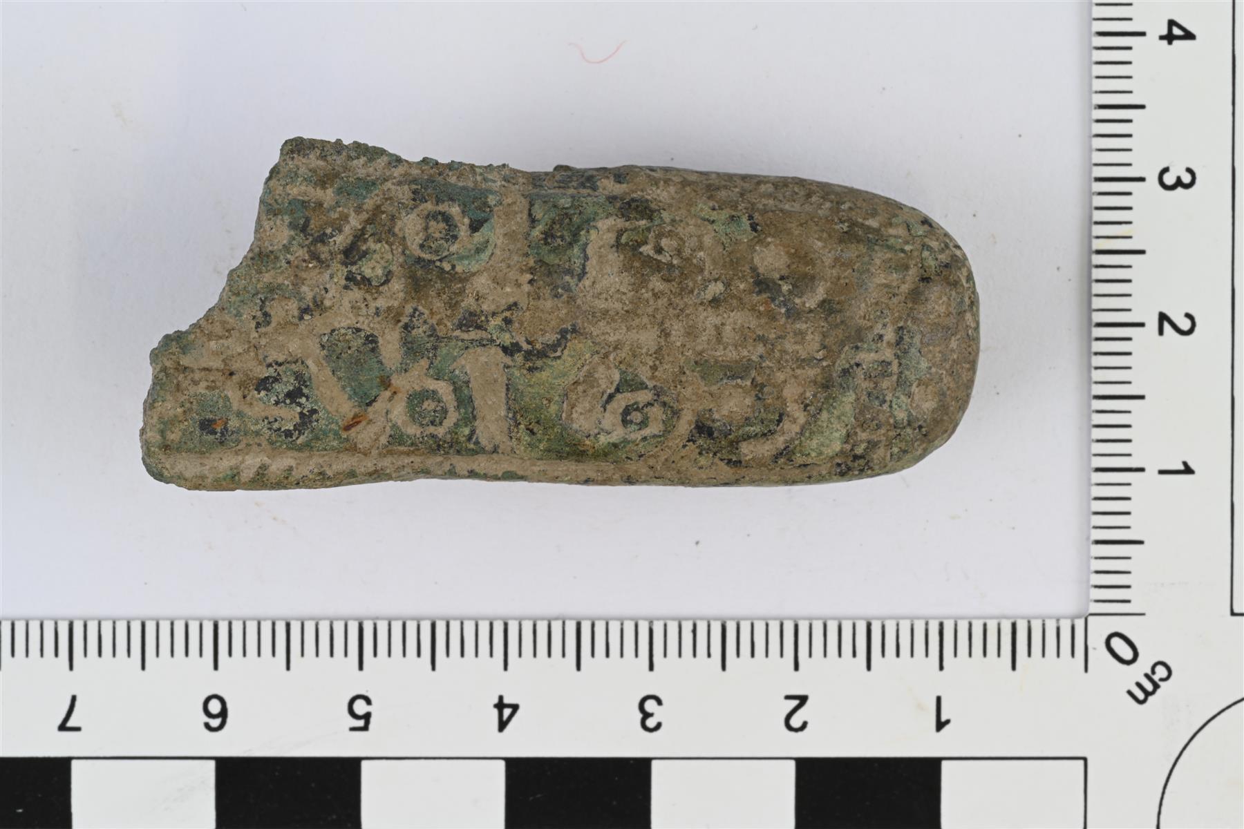 Koristellun miekan väistimen katkelma. Päästä umpinainen, sisältä ontto putki, jonka poikkileikkaus soikea. Umpinainen pää pyöristetty. Kaikilla pinnoilla koristelua, jossa mm. silmäkuvioita. | |