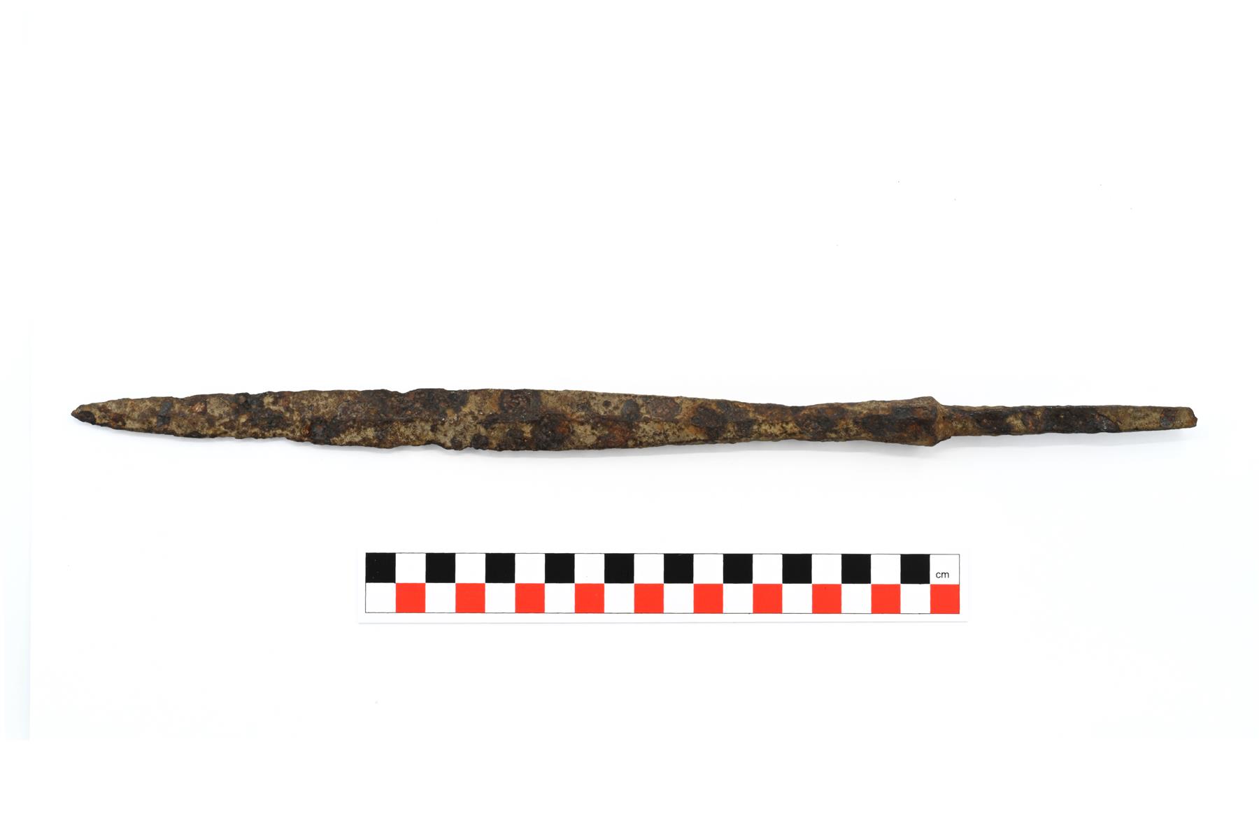 | Kokonaisena säilynyt ruotokeihäänkärki. Lehti on kapea ja pitkä. Poikkileikkaus on litteä vinoneliö. Ruoto on poikkileikkaukseltaan suorakaide, joka ohenee kärkeä kohti. Erittäin hyväkuntoinen. Edustaa Petersenin E-tyypin ruodollista muotoa. Vrt. Kivikoski Abb. 854. | |