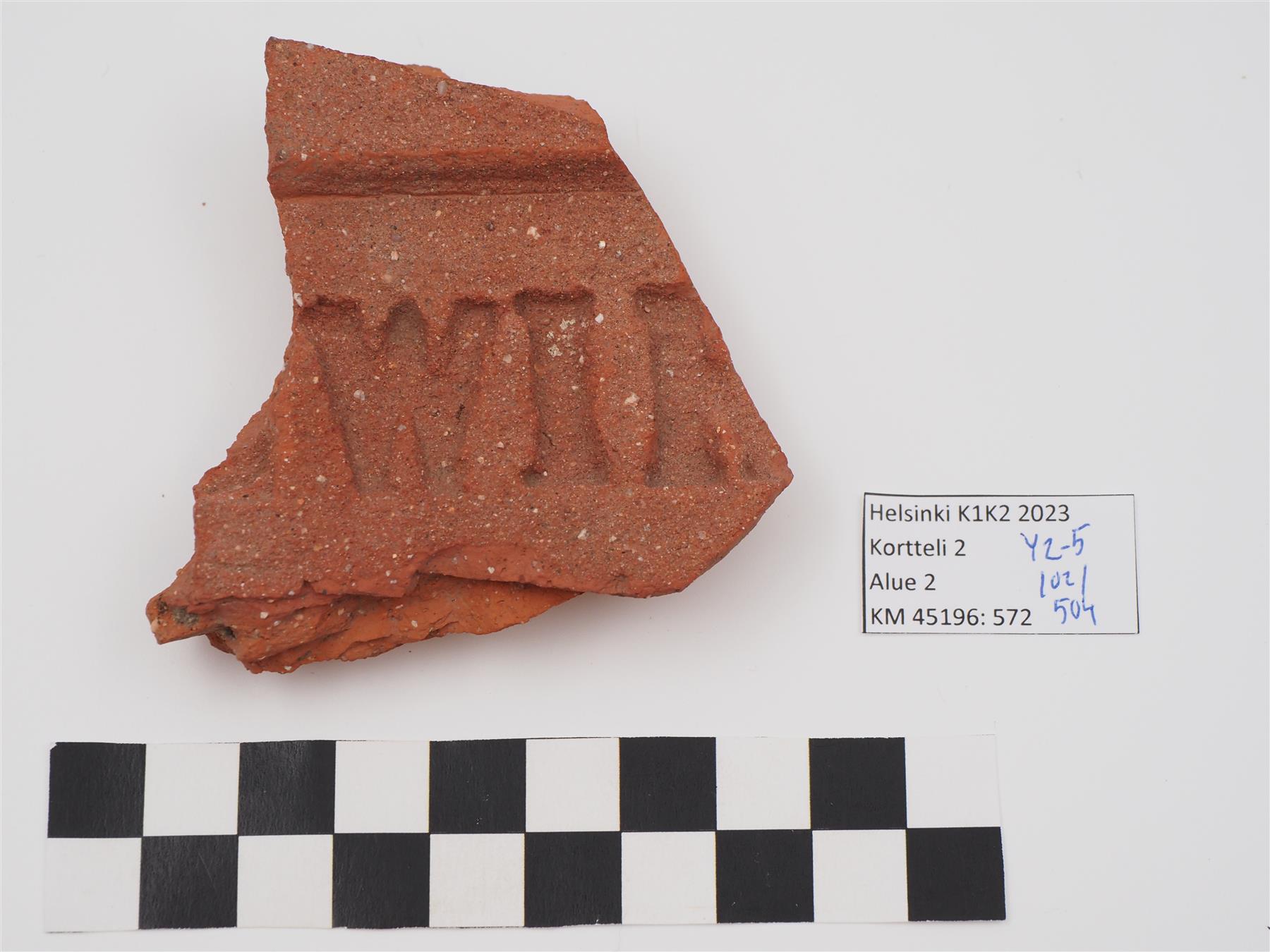 | Punsasavisen tiilen katkelma, Stensvikin tehtaalta. Pinnalla nähtävissä kirjaimet "WIK". | |