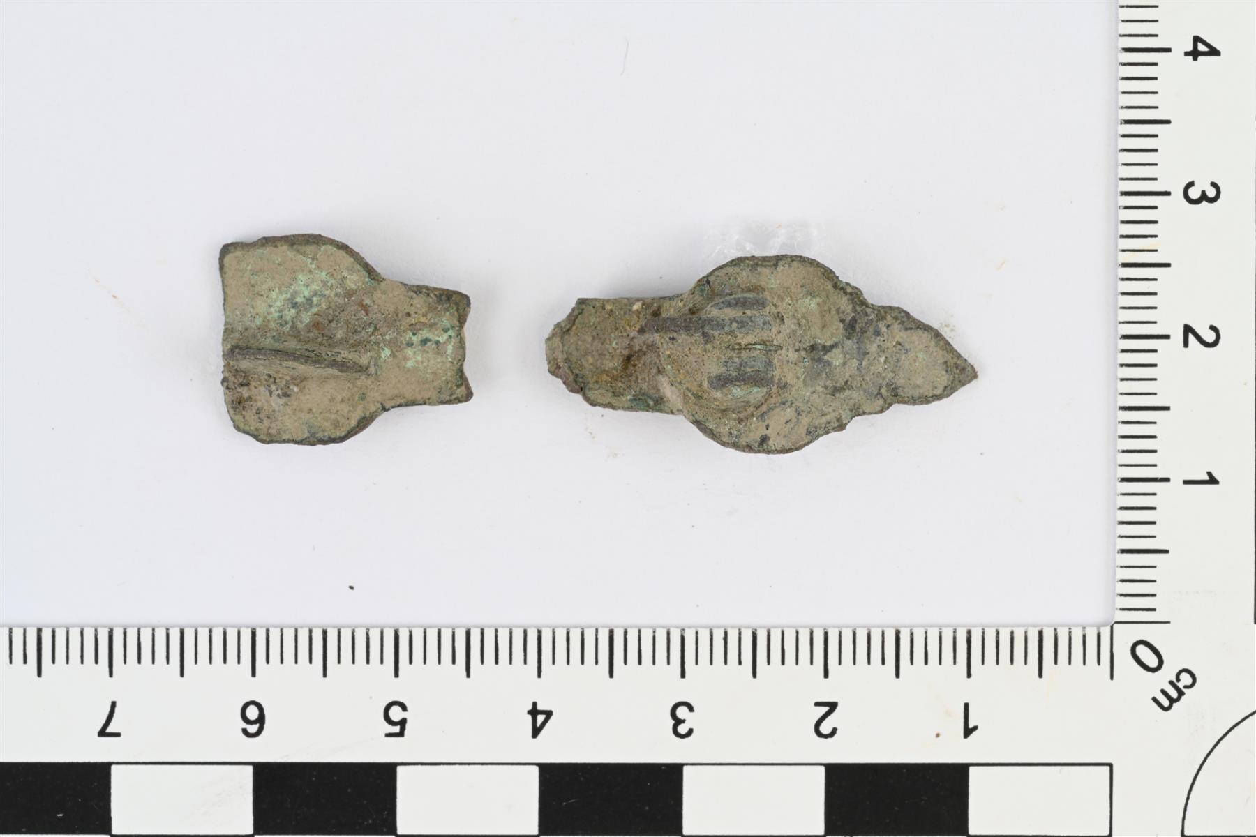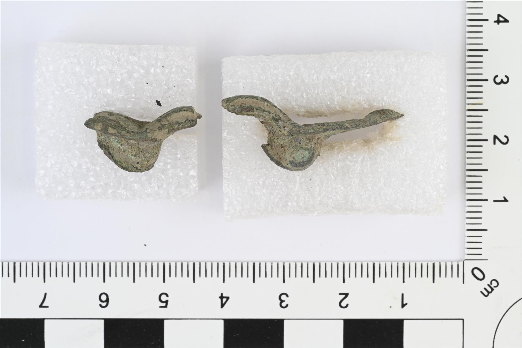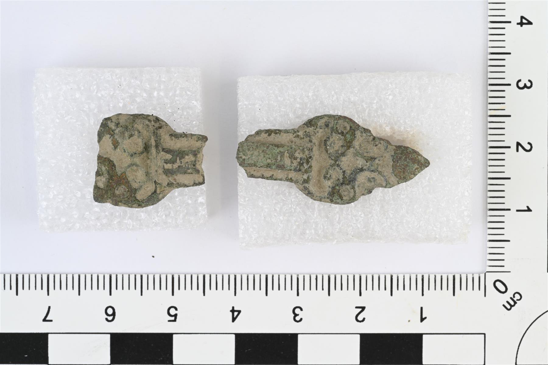 | Kaksi katkelmaa soljesta. Tasavartisen soljen tapainen, pitkänomainen, keskellä kapea kaari ja päissä leveämmät ja päihin suippenevat koristellut levyt. Toisen päätylevyn pää murtunut pois. Keskellä oleva kaari kapea, tasalevyinen, keskellä kulkee pitkittäinen kohovyö. Päätylevyissä reliefikoristelua. Päätylevyissä mahdollisesti hahmotettavissa eläimenpää, niin että levyn suippo pää muodostaa eläimen kuonon ja koristelu muodostaa mm. silmät. Taustapuolella neulakodan ja neulanpidikkeen jäännökset.