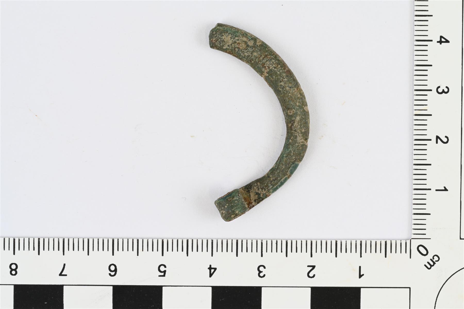 | Rullapäisen hevosenkenkäsoljen katkelma, jossa soljen toinen pää ja osa kaarta. Kaaren poikkileikkaus soikea. | |