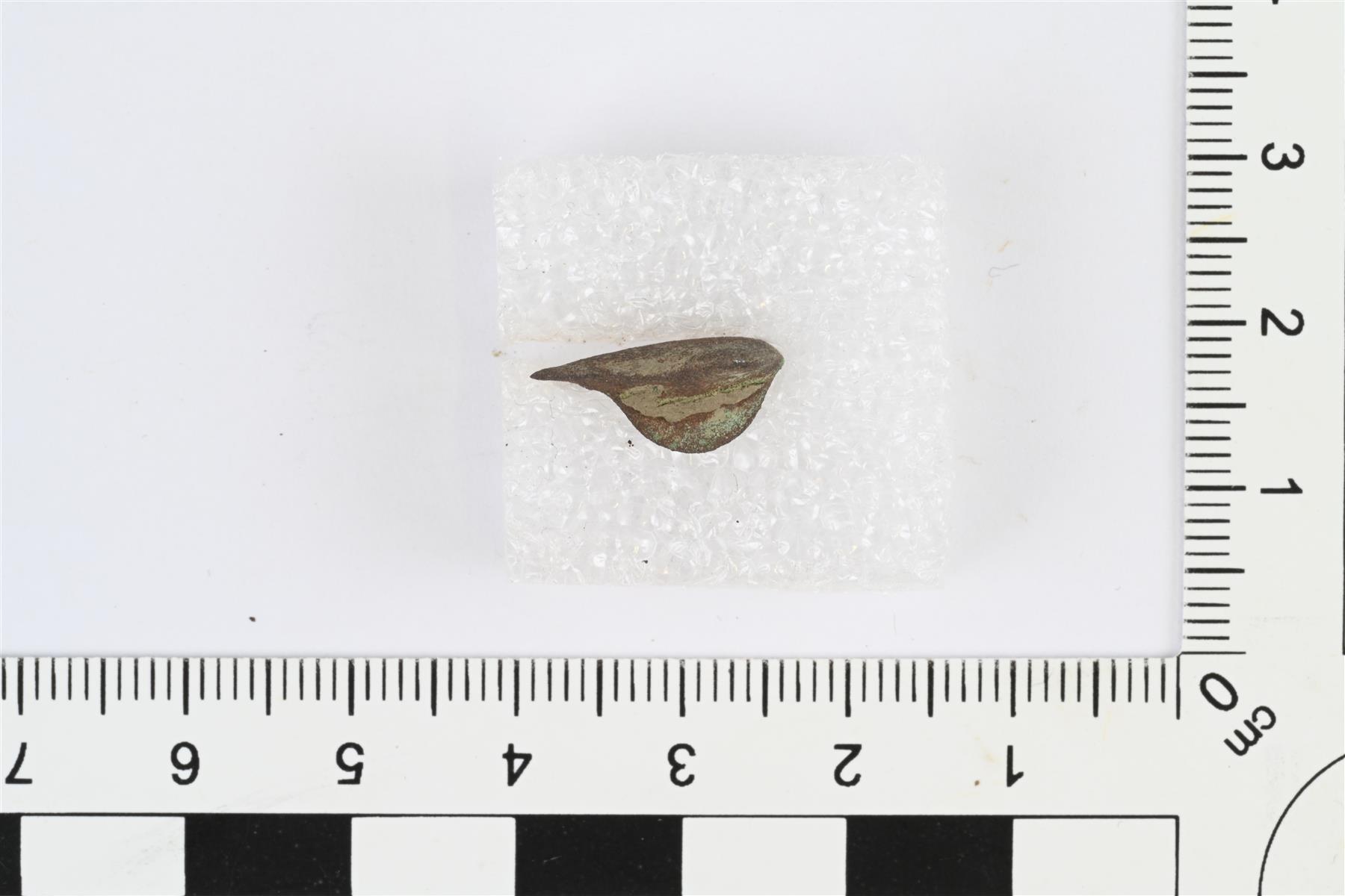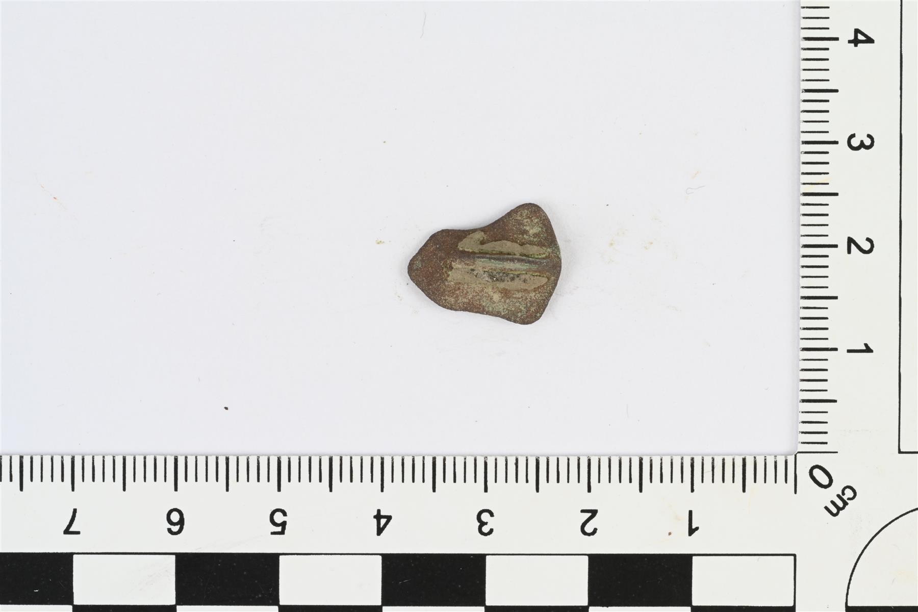 | Soljen katkelma. Etupuoli tasainen ja sileä. Taustapuolella neulalaitteen jäänne. | |