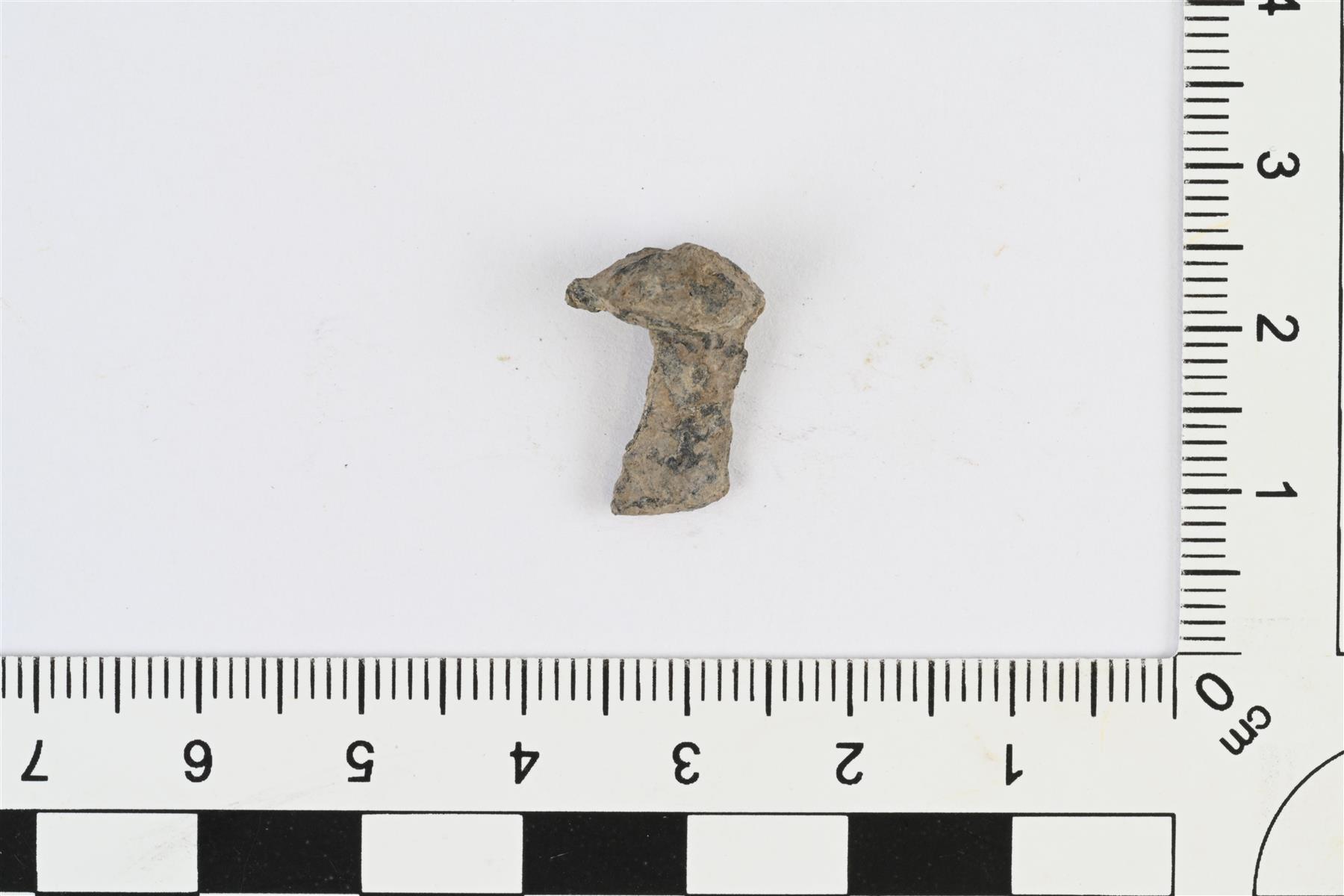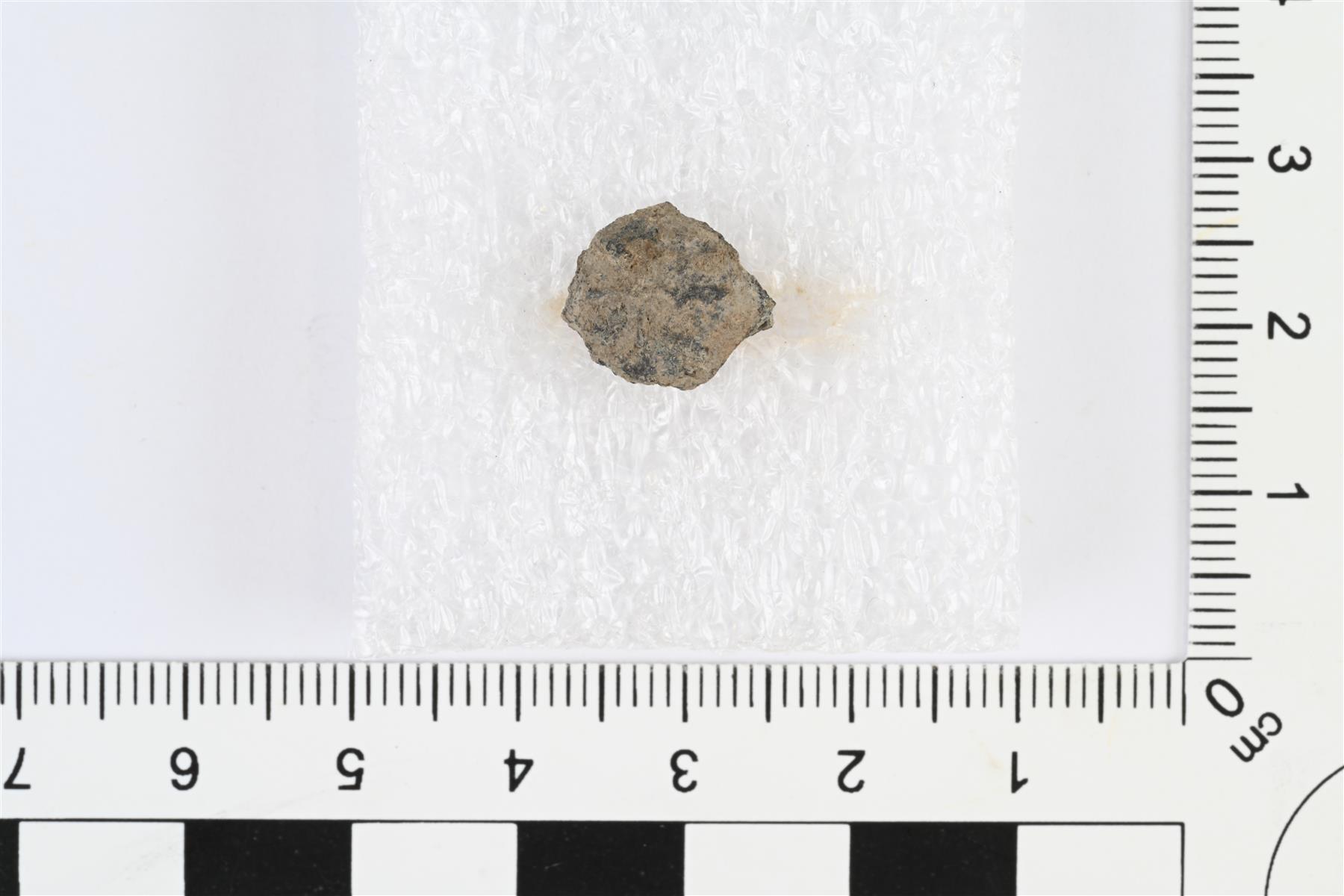 | Pieni pyöreä vyönhela, luultavasti tinaseosta. Mahdollisesti keskiosa suuremmasta pyöreästä helasta, jonka reunat murtuneet. Etupuoli kupera. Taustapuolella kiinnitystappi. Etupuolella koristeluna säteittäisiä viivoja. | |