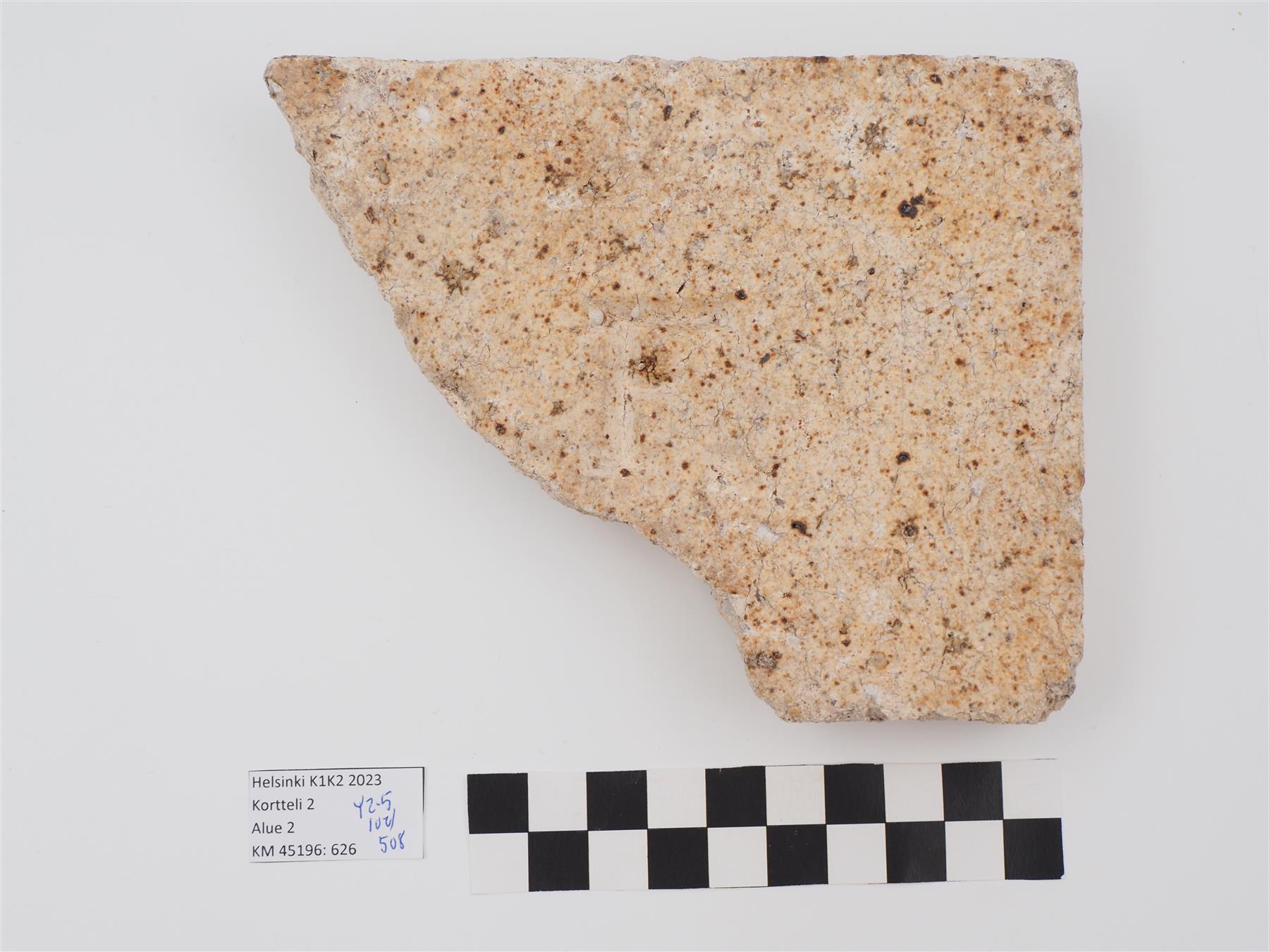Tehdasvalmisteinen valkoisesta savesta tehty tiilenpala, jonka pinnalla erottuvat kirjaimet [h].F.. Tanskalaisella Bornholmin saarella sijainneen Dansk Chamottesten Fabrik (D. Ch. F.) -tehtaalla valmistettu. | |
