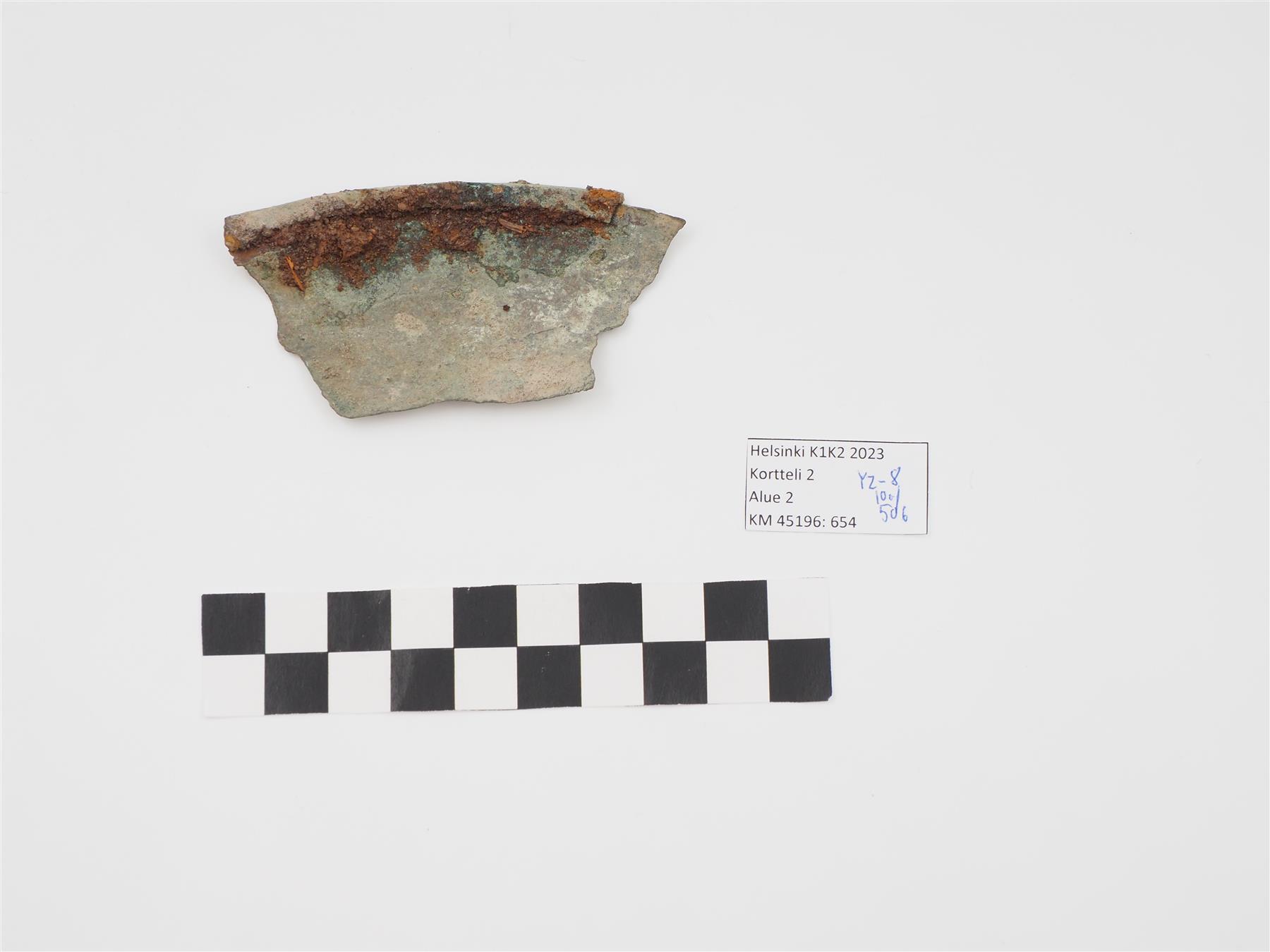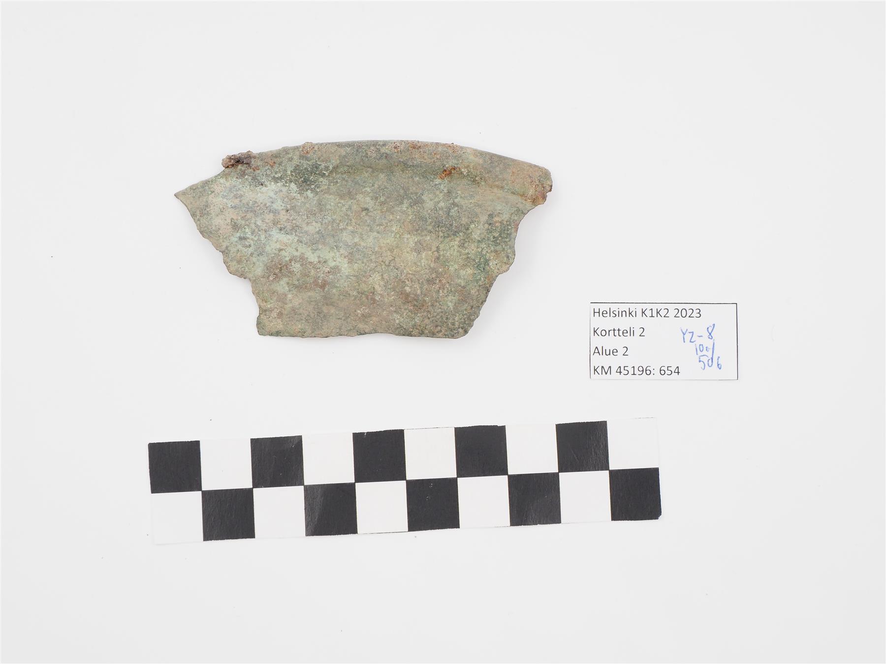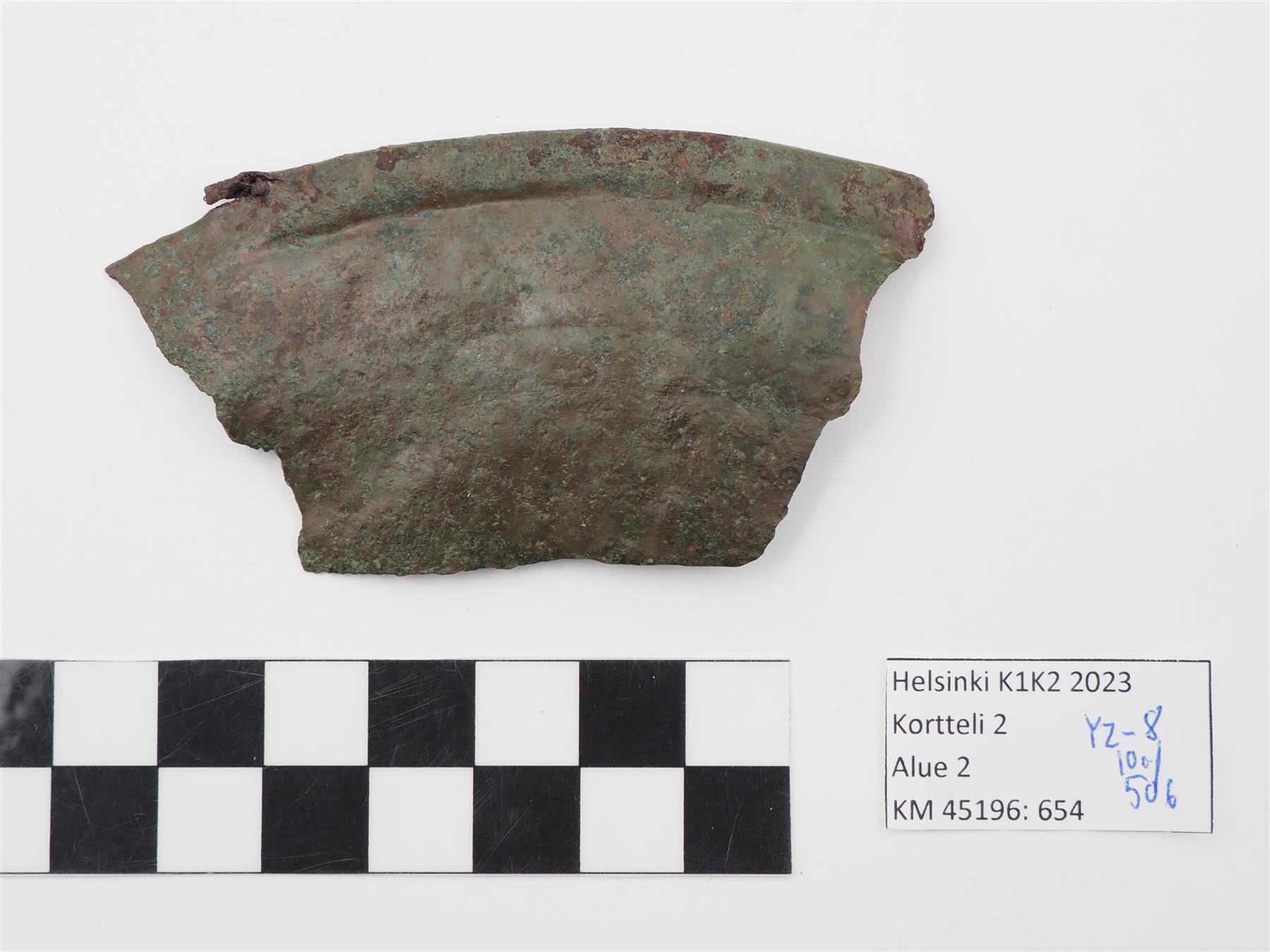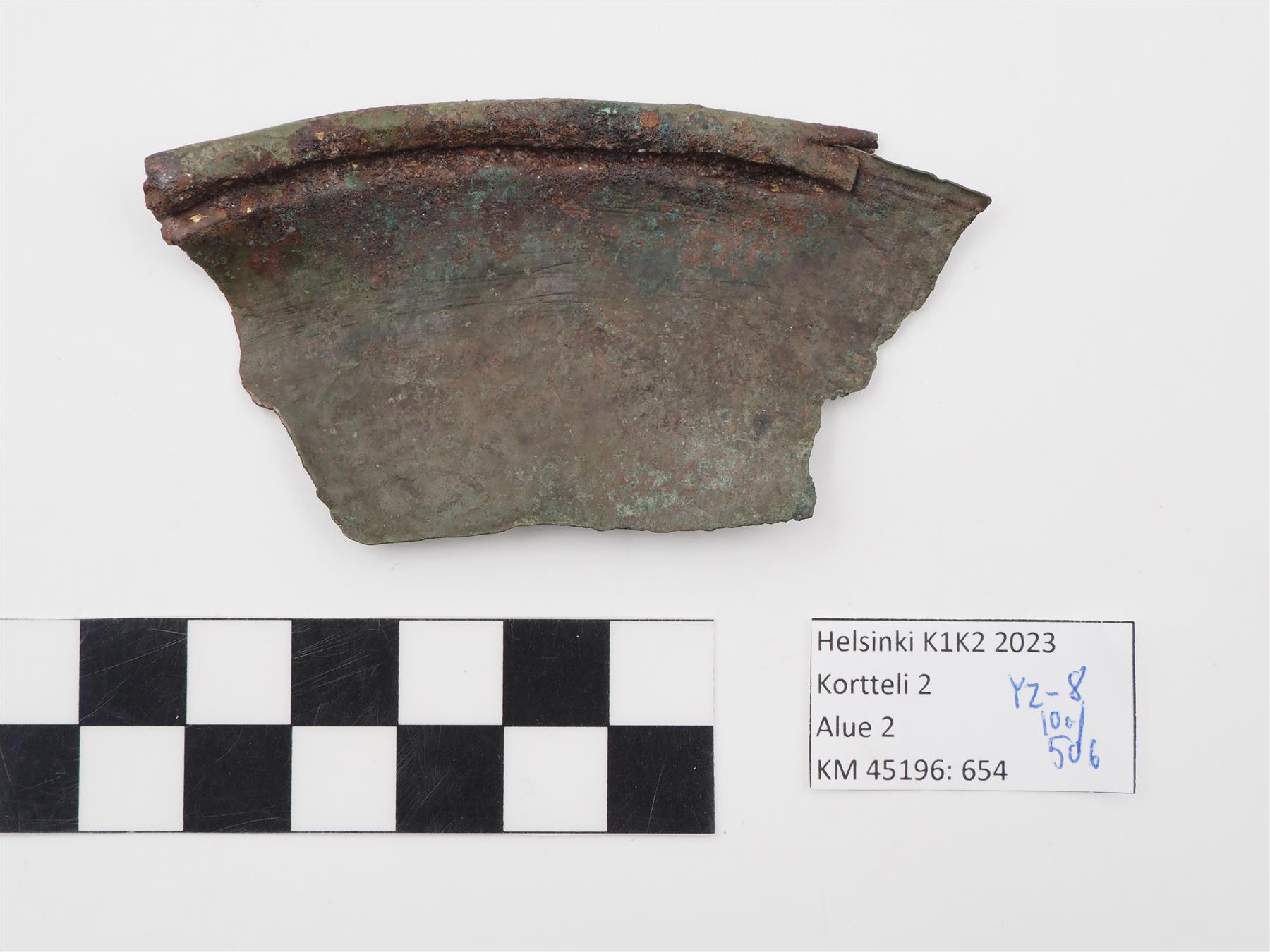 | Kupariseoksesta valmistetun esineen reunapala, jossa taitettu reuna. | |