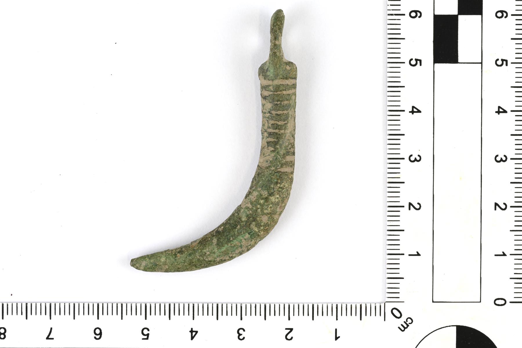 | Kokonaisena säilynyt ja hyväkuntoinen karhunhammasriipus. Yläosassa on koristeluna poikittaisia viivauurteita. | |