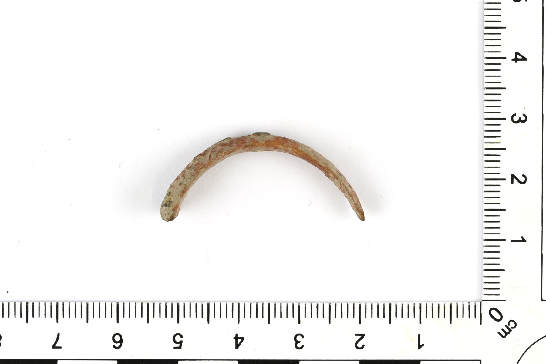 | Toiseen päähän levenevän rannerenkaan katkelma. Ulkopinta on kupera ja taustapuoli suora. Leveämmässä päässä erottuu poikittaisia viivauurteita. Melko siro ja pienikokoinen. Pinta on hyvin kulunut. | |