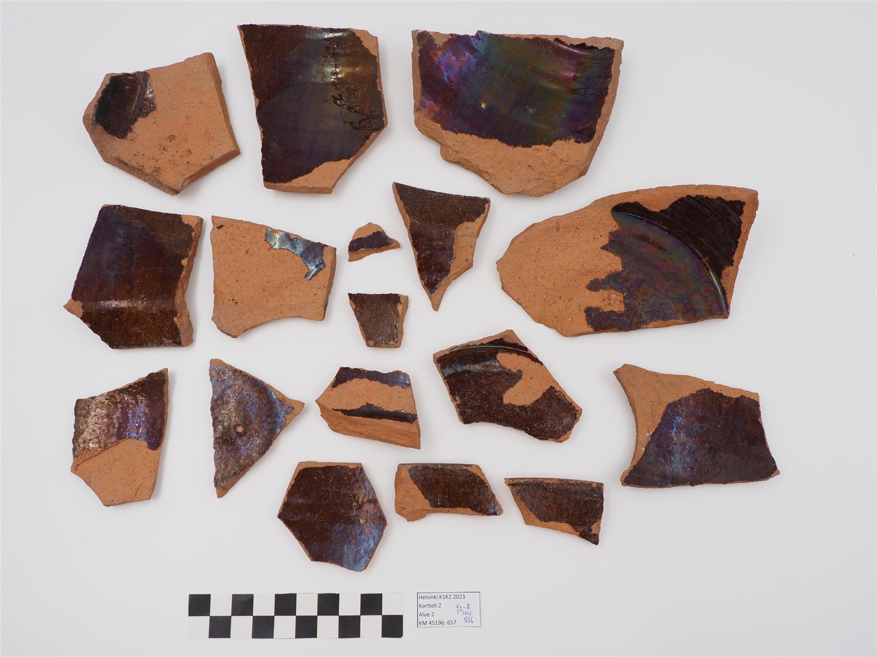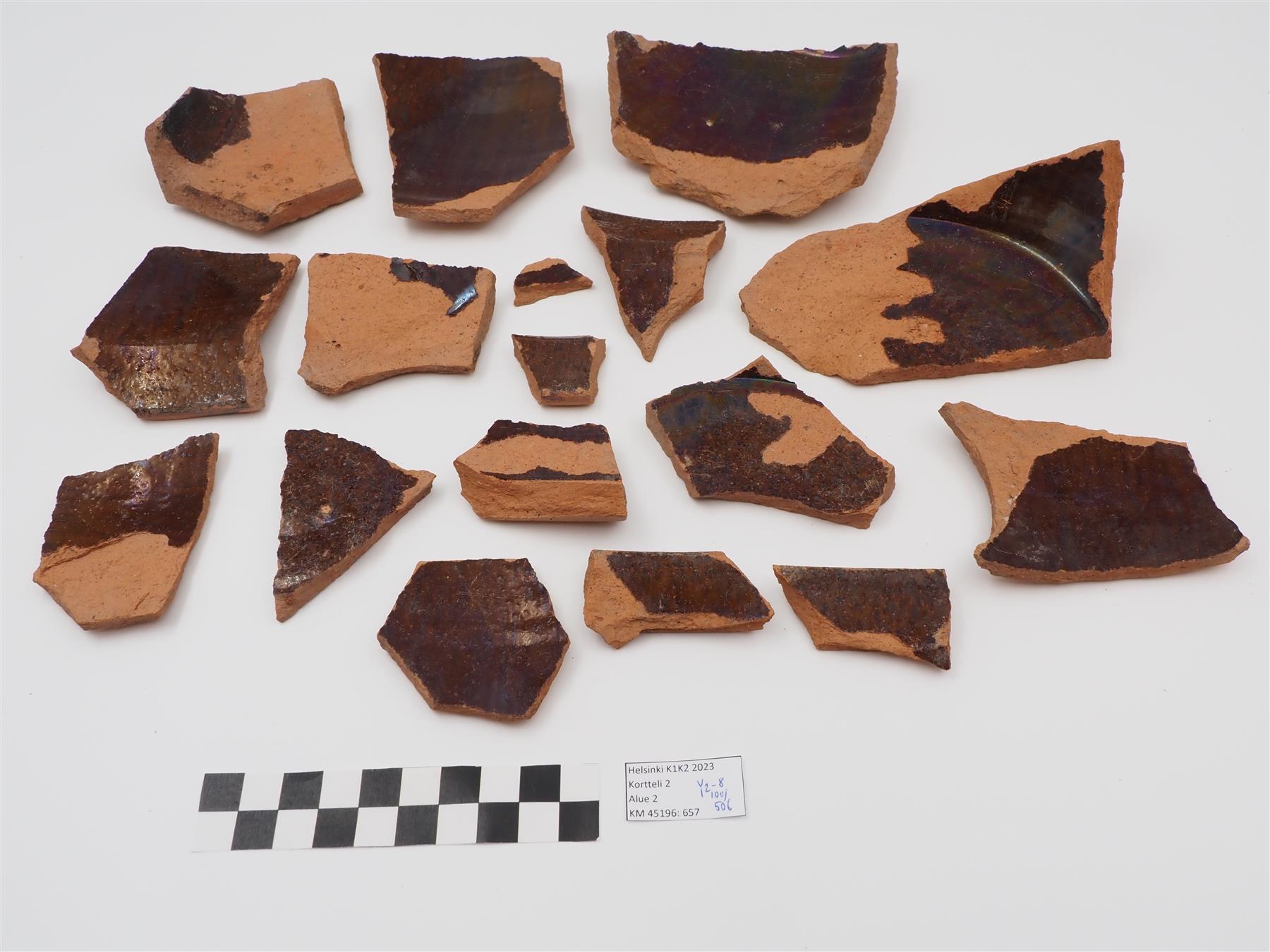 | 17 kappaletta suurikokoisen punasaviastian paloja. Sisäpinnalla tummanruskea lyijylasite, jossa vielä tummanruskeampia pystysuuntaisia viivoja. | |
