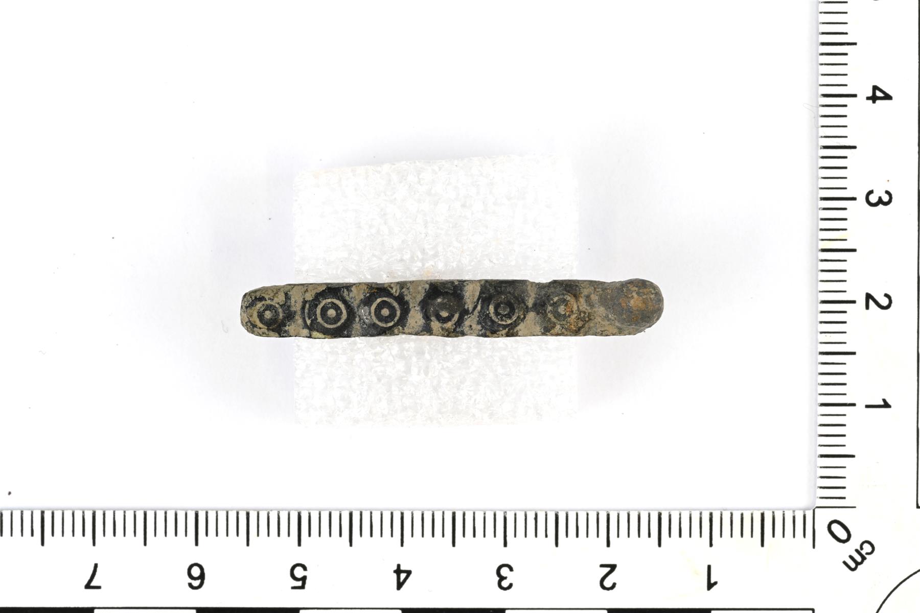 | Osittain sulanut helmen- tai ketjunjakaja. Muodoltaan kapea suorakaide, jonka koristeluna on häränsilmäleimoilla varustettuja vinoneliöitä. Taustapuolella oleva ketjujen kiinnitysosa on hajonnut. Vrt. Kivikoski Abb. 773. | |